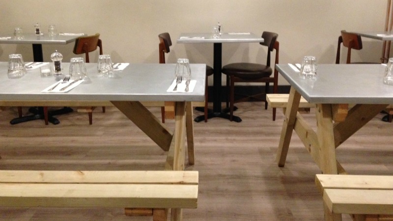 There are some 30 seats inside Flour & Ash, with wooden picnic tables with metal covers down the centre of the dining room which also features a pile of chopped wood making up the bar.