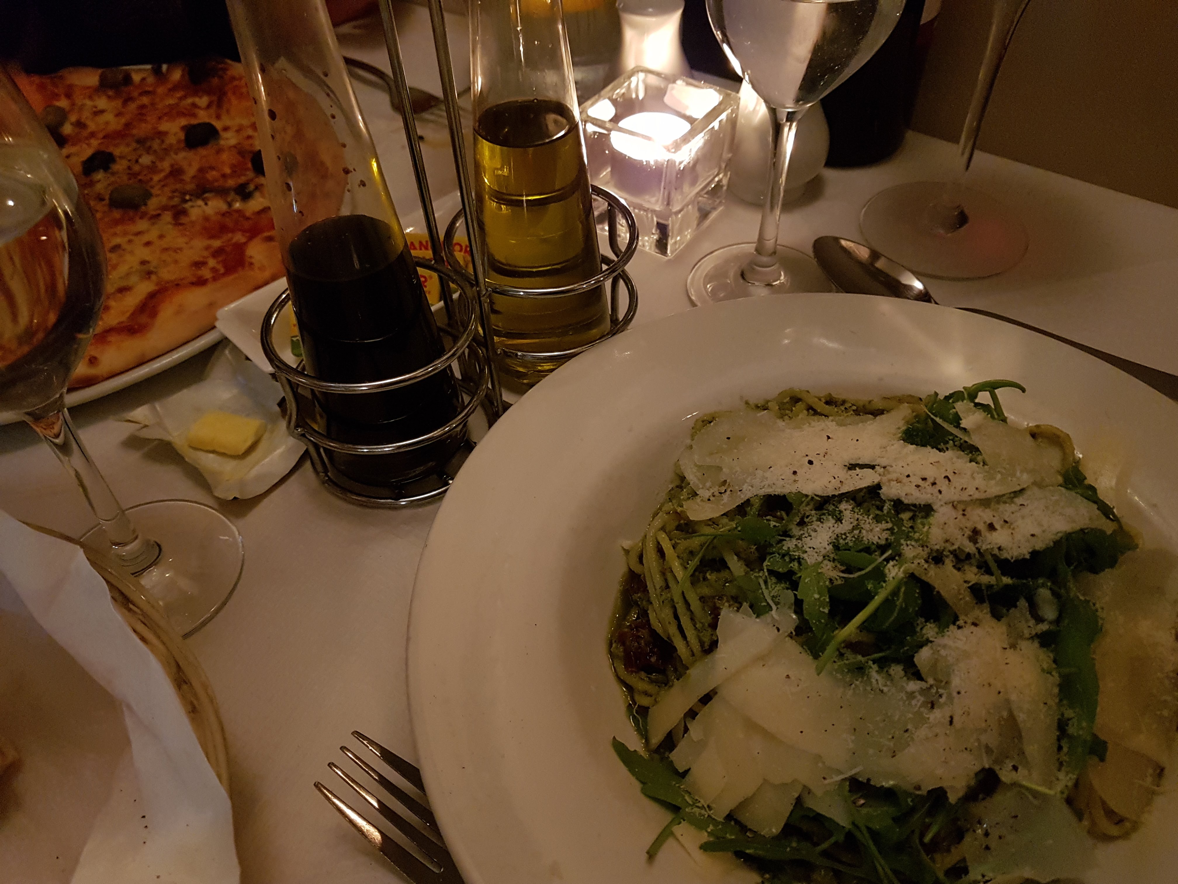 Smartly dressed, polite and efficient wait staff bring the wine, ordered from an extensive list. This is quickly followed by water and a generous basket of fresh, crusty bread (£2.95) – perfect for soaking in vats of rich olive oil and balsamic vinegar.