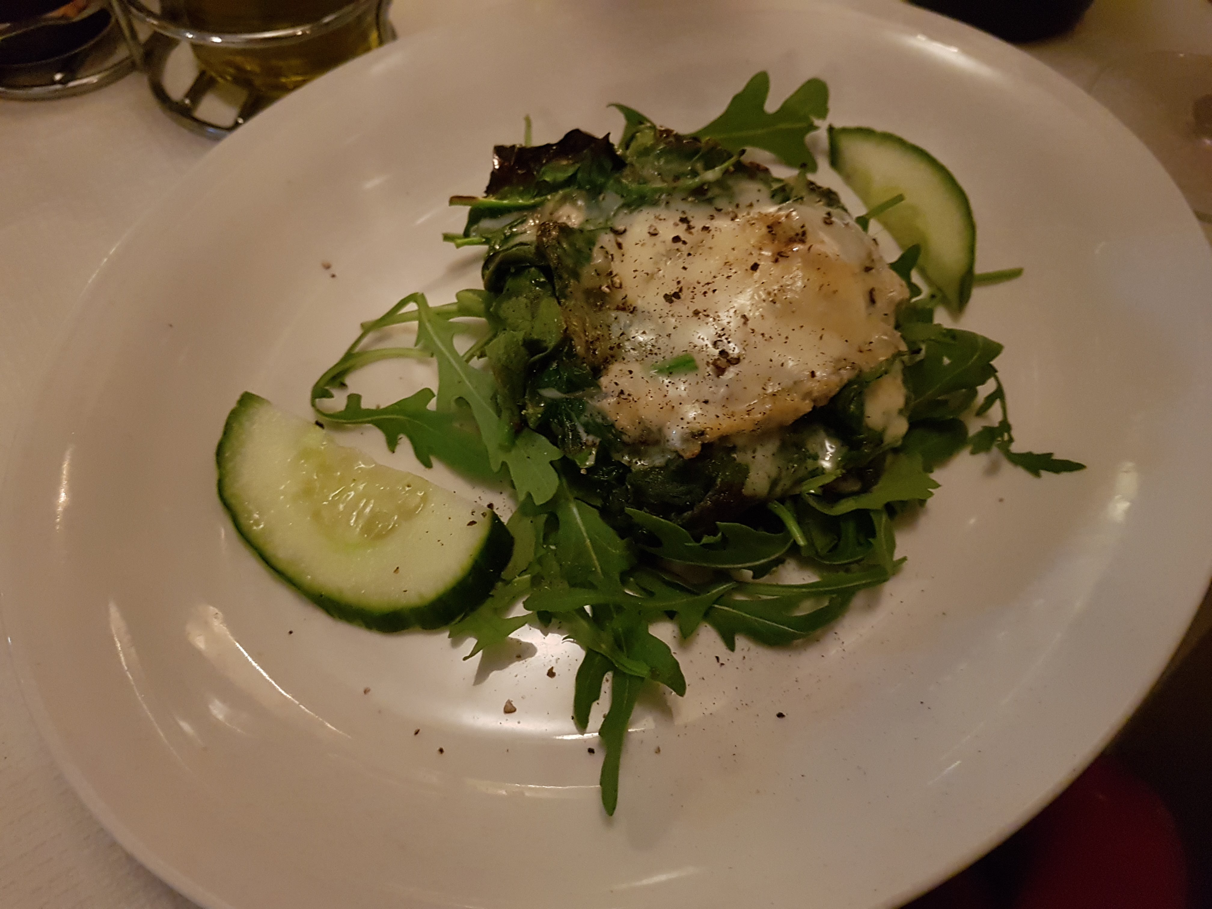 Cheese is the overpowering taste of the funghi Portobello (£7.95) – a large mushroom set upon a bed of fresh rocket with two token slices of cucumber and oozing with a pungent topping.