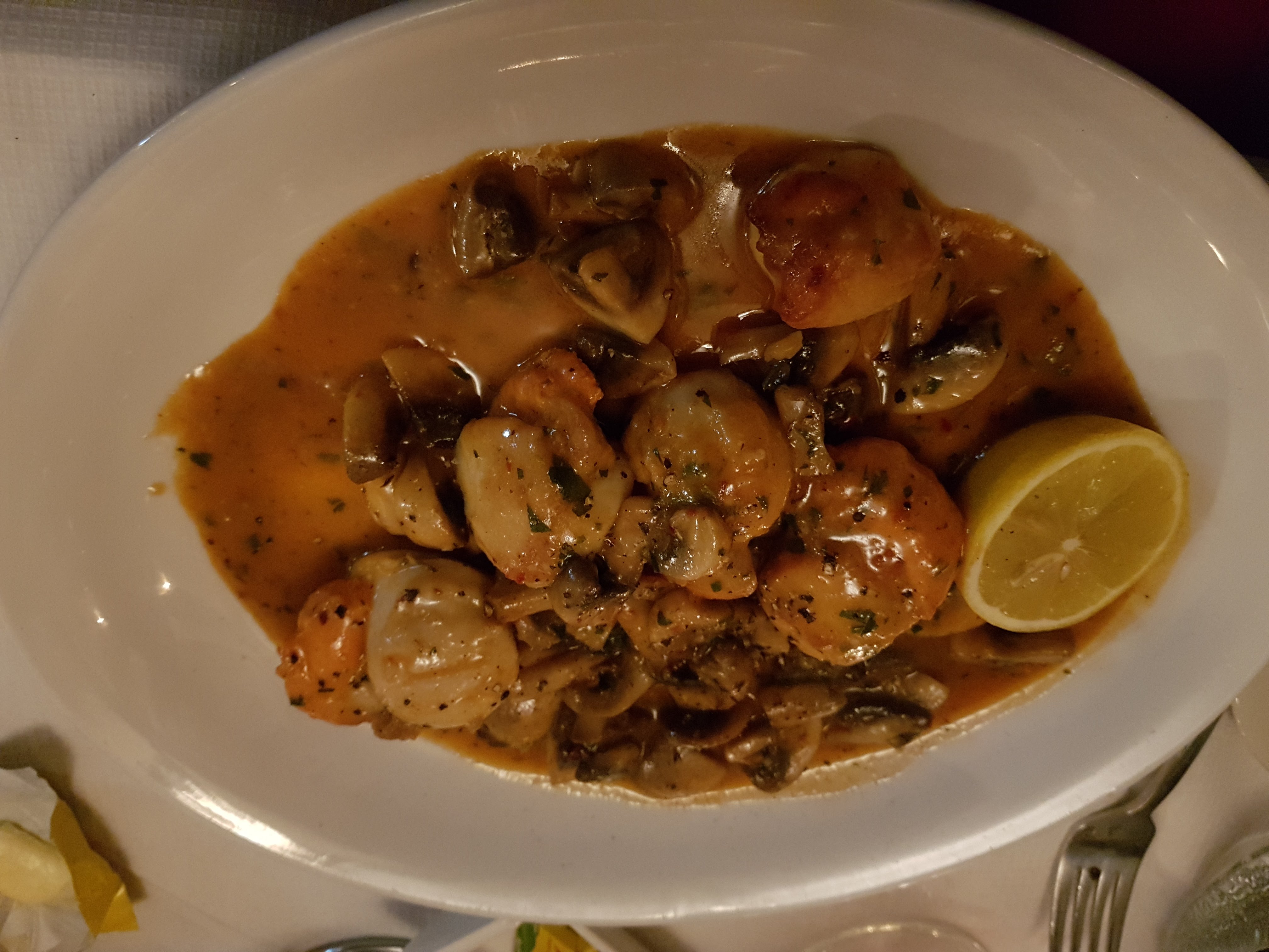 Pan fried fresh scallops (£9.95), served with white wine, mushrooms, garlic and just a hint of chilli, are beautifully light, delicate to bite and with a rich sauce, just made for soaking up with more chunks of crusty bread.