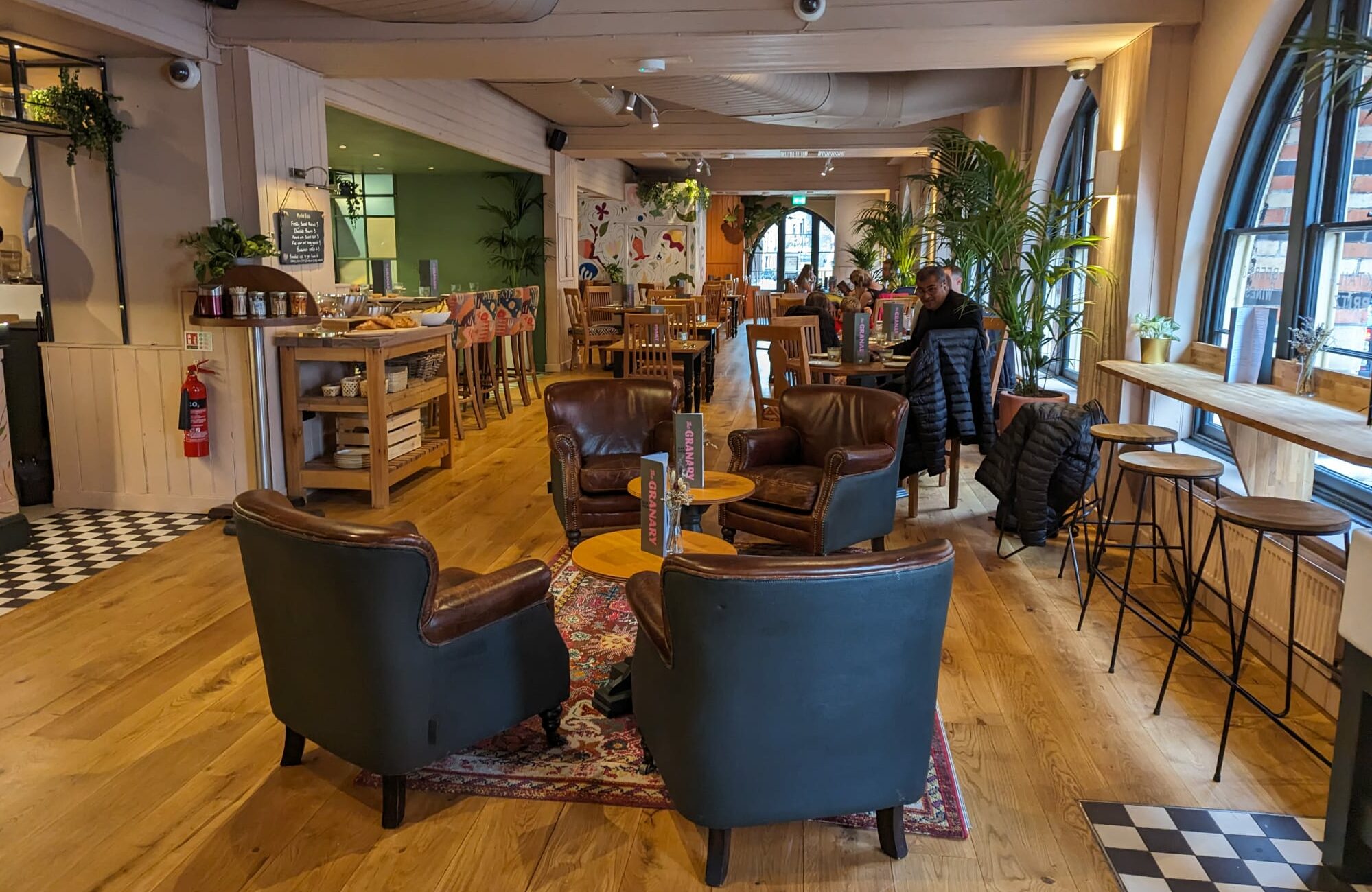 The building – that was most recently home to Loch Fyne and before that Belgo – has been given a glow-up. The far wall boasts a vibrant mural by artist Ellen Donahue and long gone are the sticky floors of old, to be replaced with shiny wooden floorboards, while pastries and fruit are laid out on a small breakfast bar. The effect is bright, cosy and welcoming.