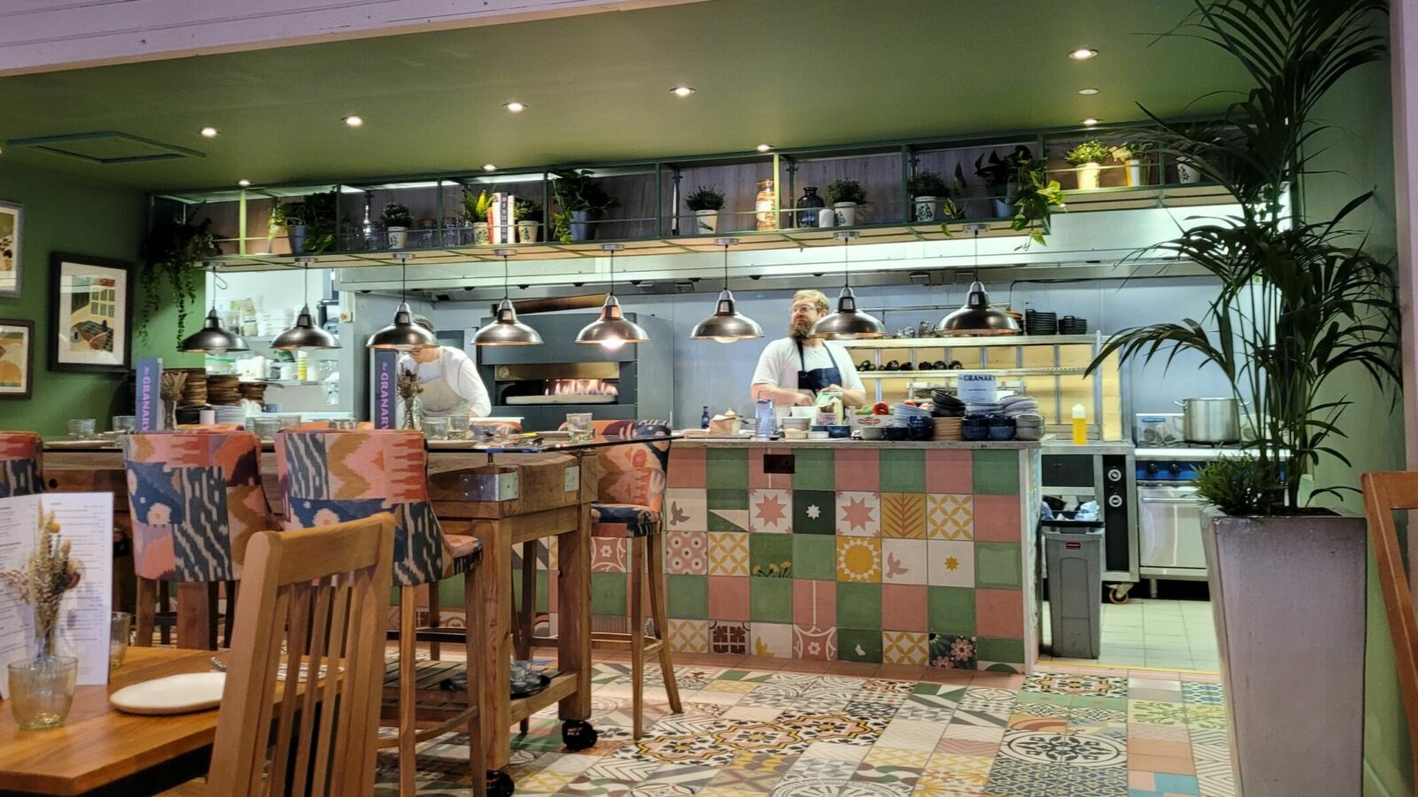 Flames can be seen flickering away in the open plan kitchen where two chefs are busy plating up for the diverse lunchtime crowd that includes families in for a half-term treat, workmates stopping for a quick bite, and a lone diner lingering over a bread and dip.