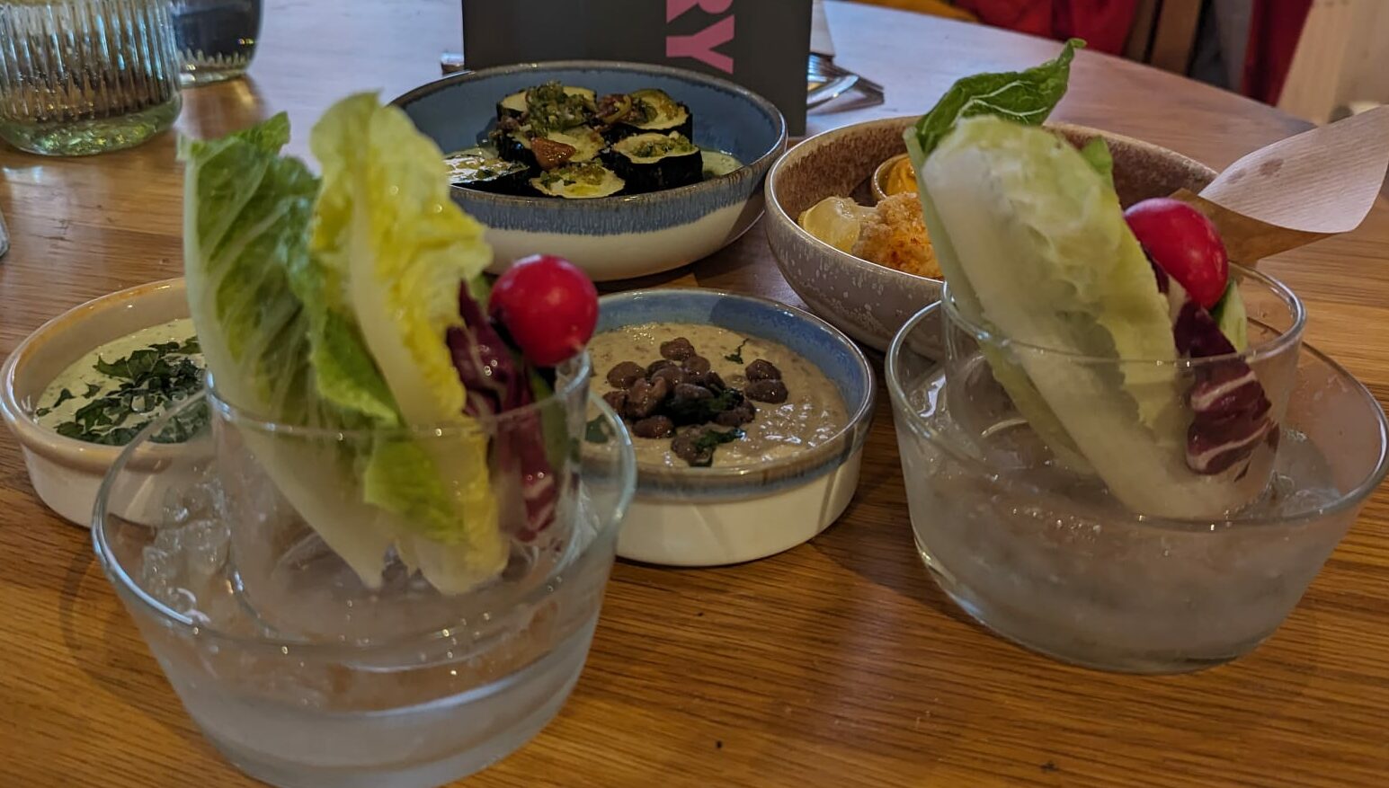 Dips to die for, along with crudités, fish tempura and a courgette that has received a masterful fire grilling