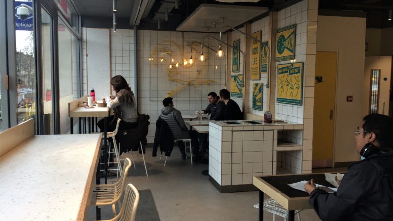 The backlit menu above the long white-tiled counter offered the usual burgers, fries and shakes that you’d expect from a fast-food joint, but also healthier options including wraps and salads.