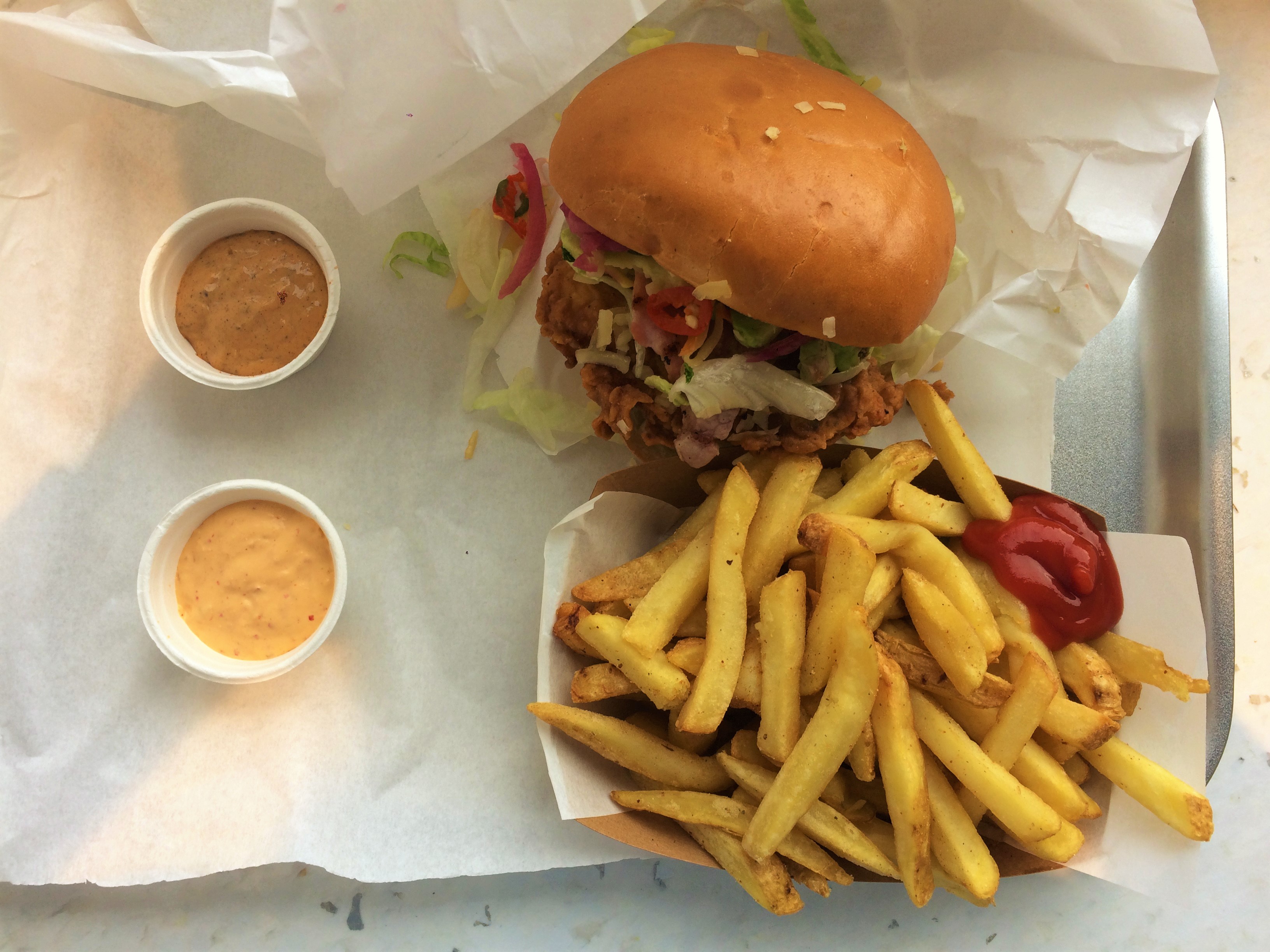 A chicken burger with a generous portion of fries and two home-made sauces