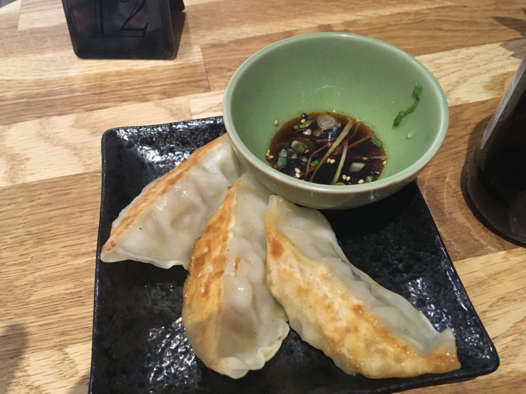 Three pork gyoza (vegetable and chicken are also available) are cooked to crisp perfection, with translucent skins browned on one side and fillings packed with meat. The remaining dipping sauce – soya sauce and vinegar with extra spring onion – ends up in with the udon adding some extra flavour to the last few mouthfuls.