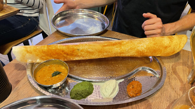 At Kal Dosa, the ones served are more than two feet across and rolled in on themselves so they hang off their plate, prompting people’s faces to light up with childlike glee when they are served. To not try them would be a crime.