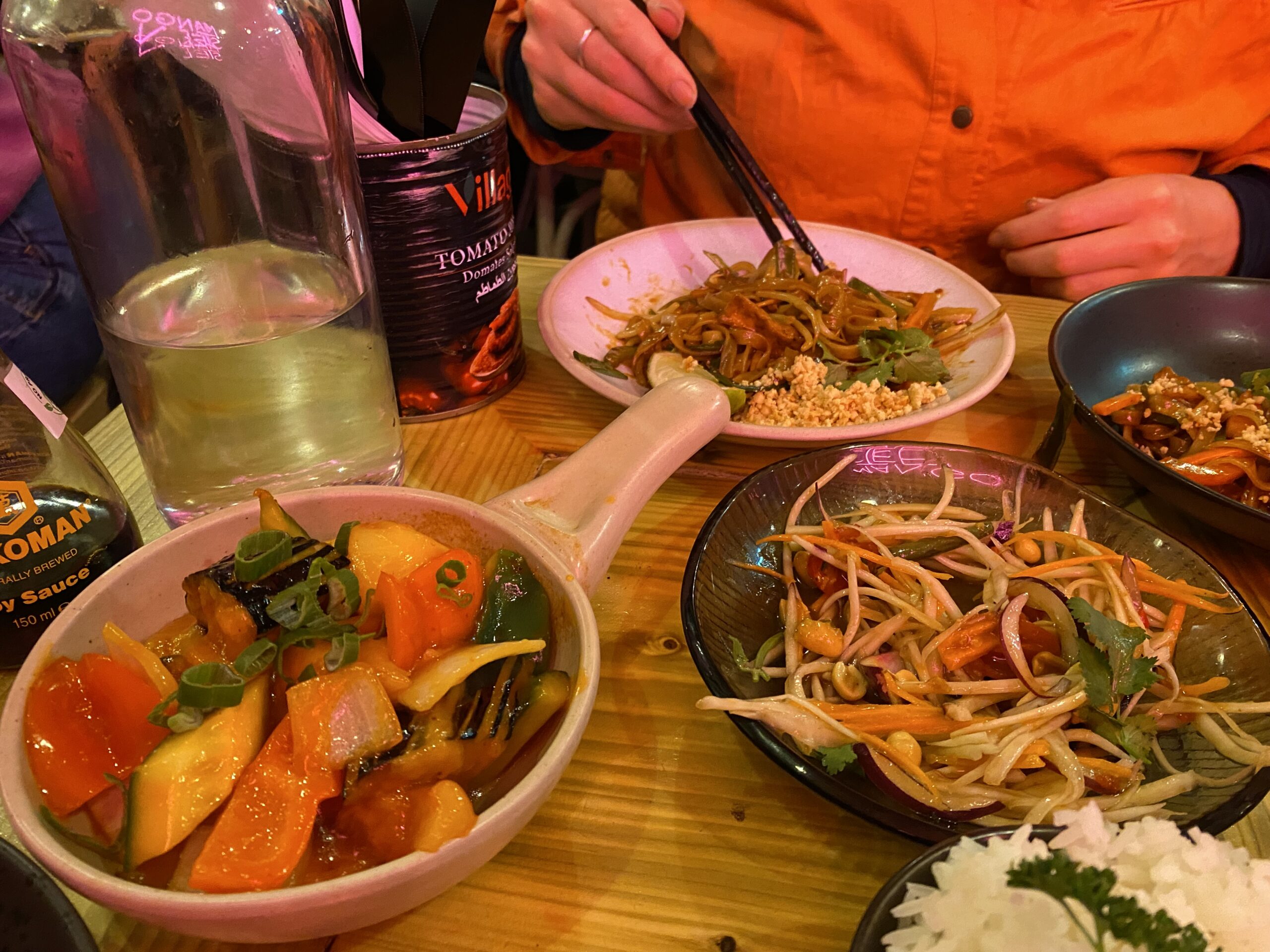The menu is a whistle stop tour through Thai classics as smaller tapas-style dishes. We opted for sweet and sour aubergine (£8) and Som tam salad (£6) from the small plates menu, alongside a classic Thai green curry (£9) and Pad Thai noodles (£7).