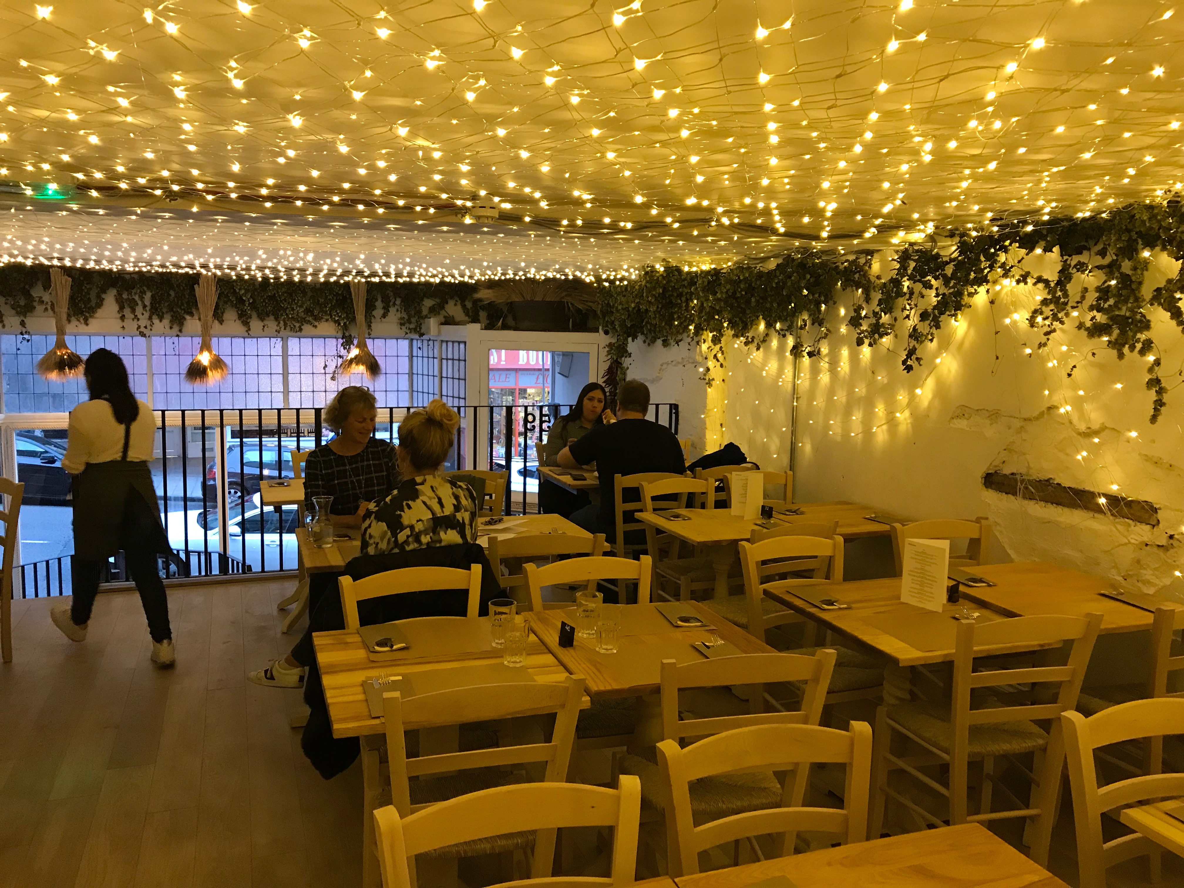 Downstairs is the bar and open kitchen while upstairs a second dining room has a ceiling bedecked in fairy lights and dripping with greenery.