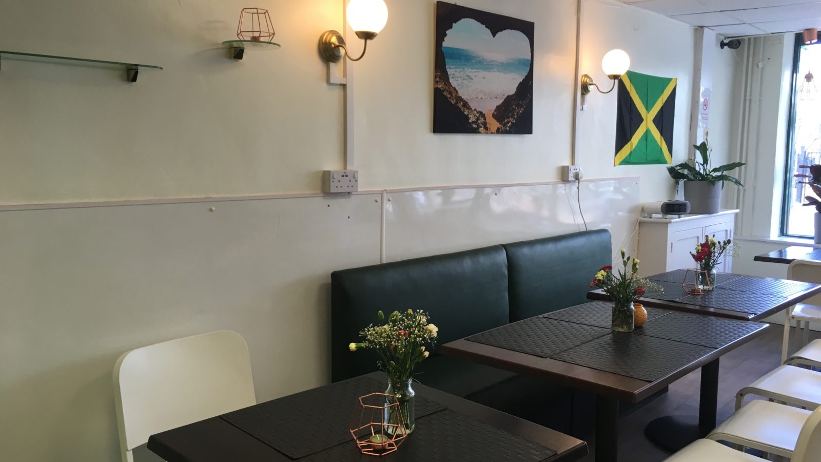 Brightly lit and freshly painted, a Jamaican flag hangs on the wall. Despite the quiet atmosphere, the café is welcoming, with flowers on the tables and leafy plants on the window ledges.