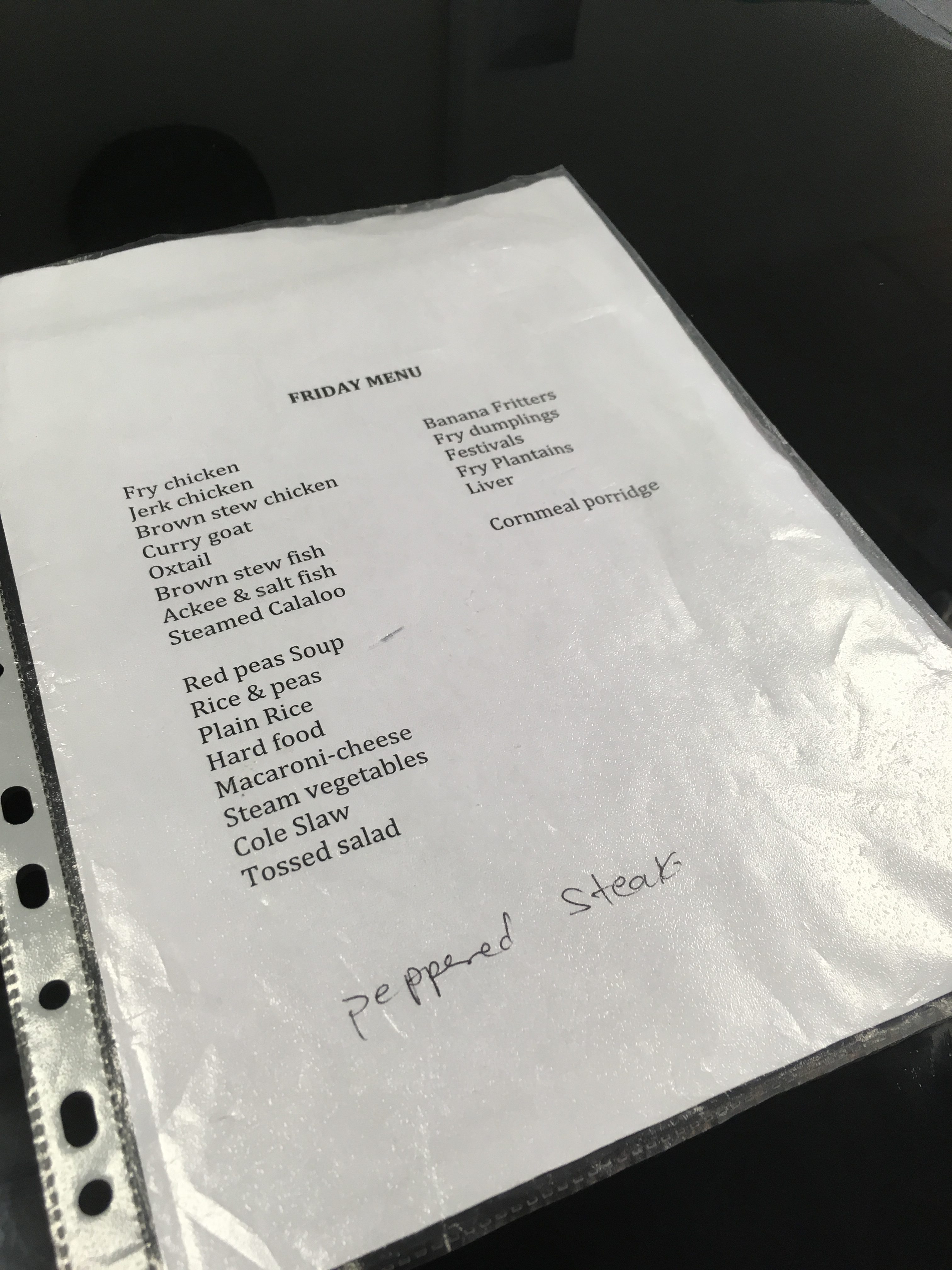 Friday’s menu – the food changes each day