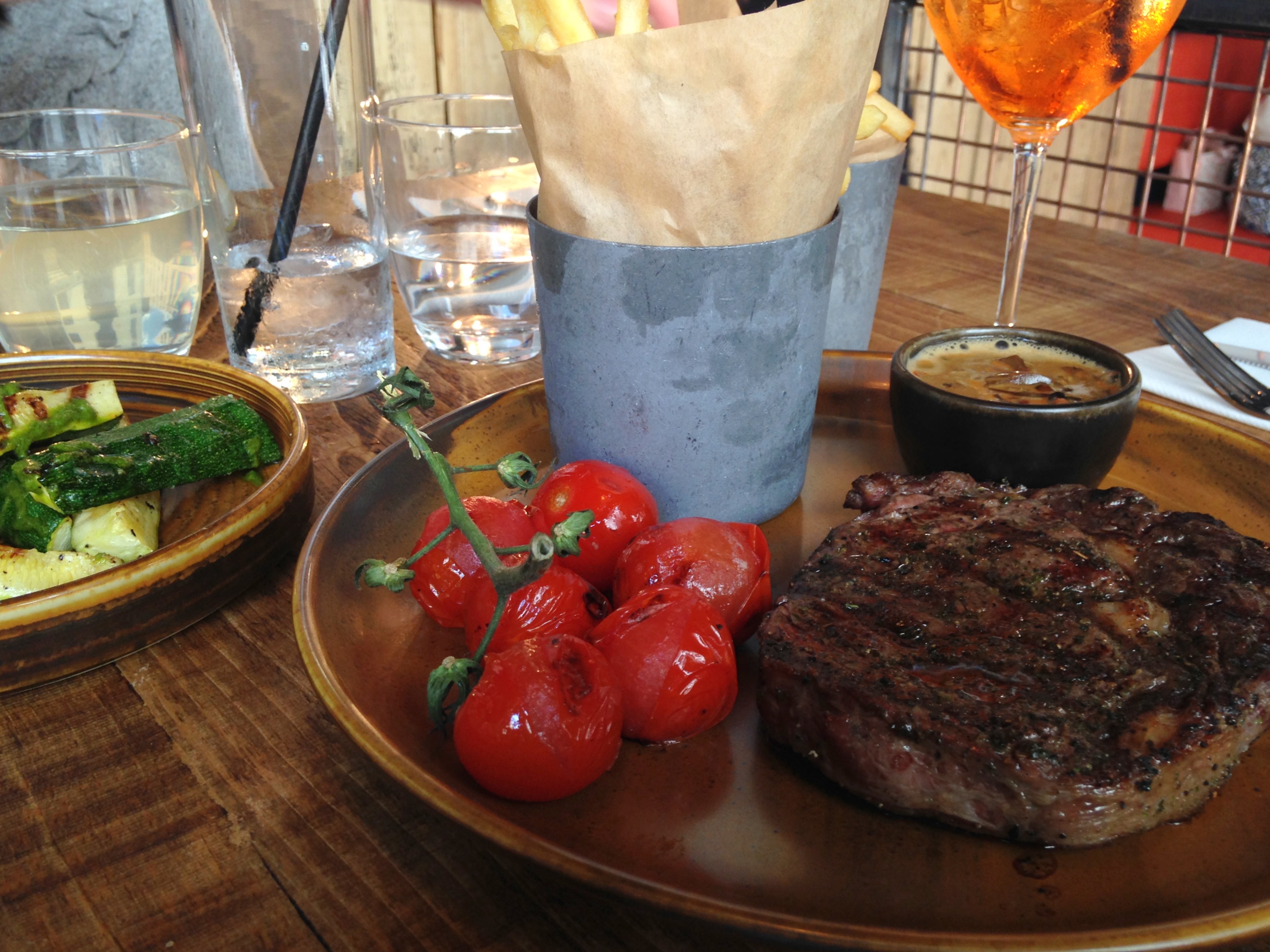 But the star of the show was a rib-eye steak for £19, served with fries, grilled tomatoes still on the vine and a peppercorn sauce.