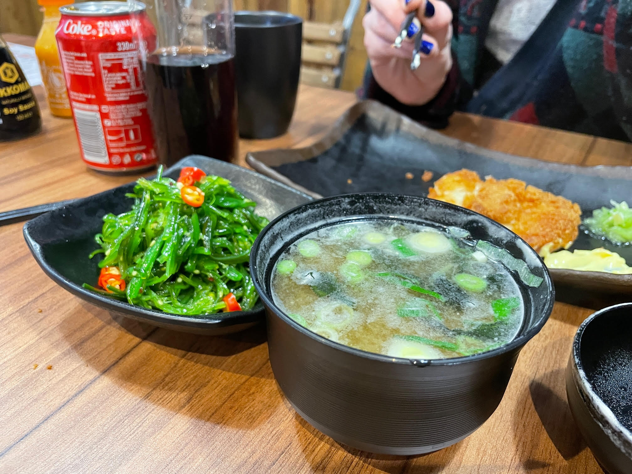We ordered miso soup (£1.99), goma salad (£4.30), karaage chicken (£5.50), tonkotsu ramen with chashu pork belly (£12.99) and miso ramen with chicken katsu (£12.99).