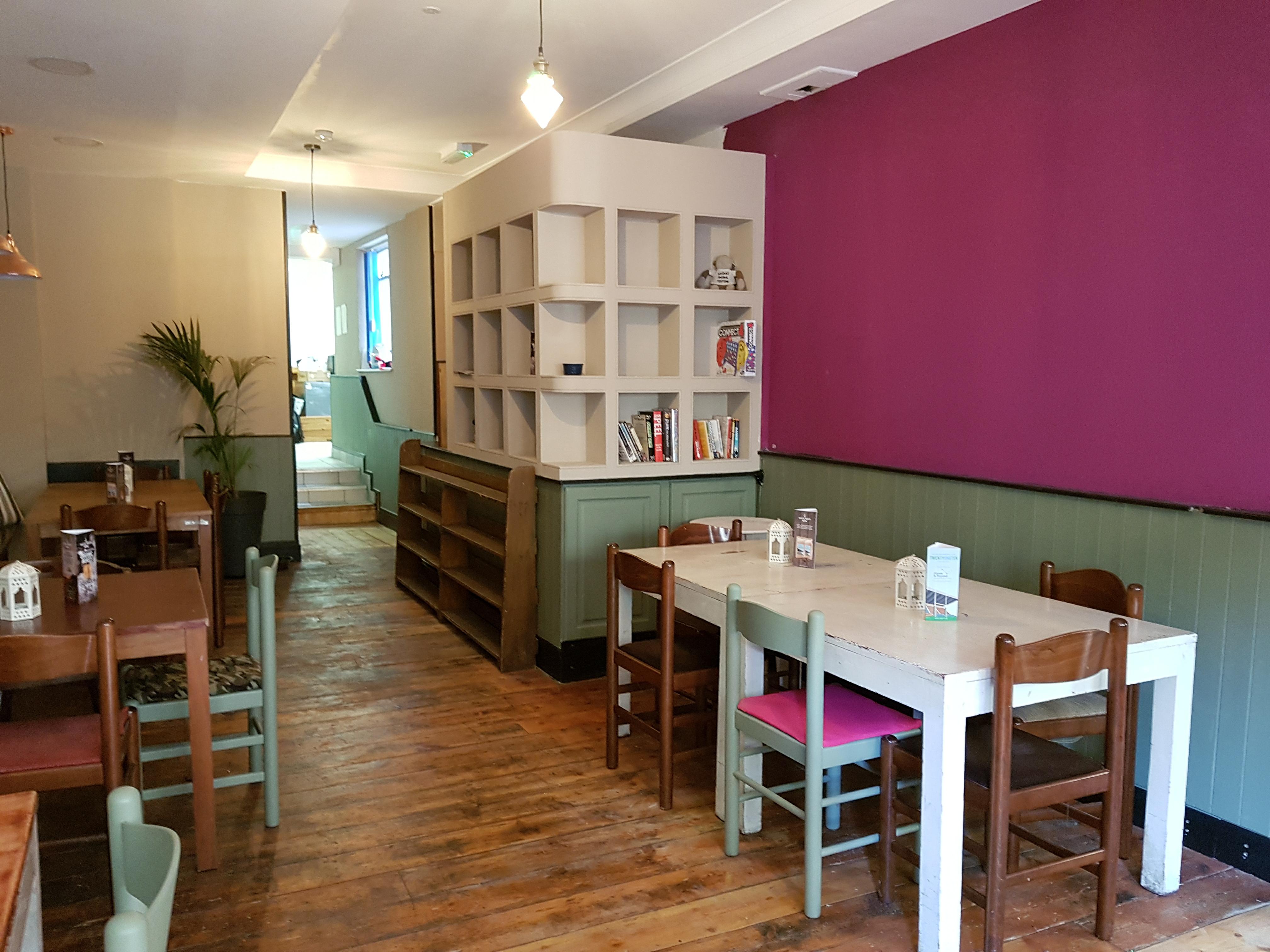The interior of this spacious cafe and restaurant is homely and welcoming – comfy chairs waiting ready at solid wood tables, while a platter of vegan iced buns sit temptingly on a solid counter top.