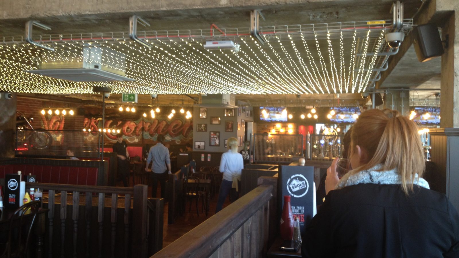 Mid-noughties American rock tunes were playing at a low level, and a replay of a basketball match showed on the TV screens above the bar. The waitresses were all dressed in blue jeans and chunky desert boots, just to make sure we had guessed the gimmicky theme.