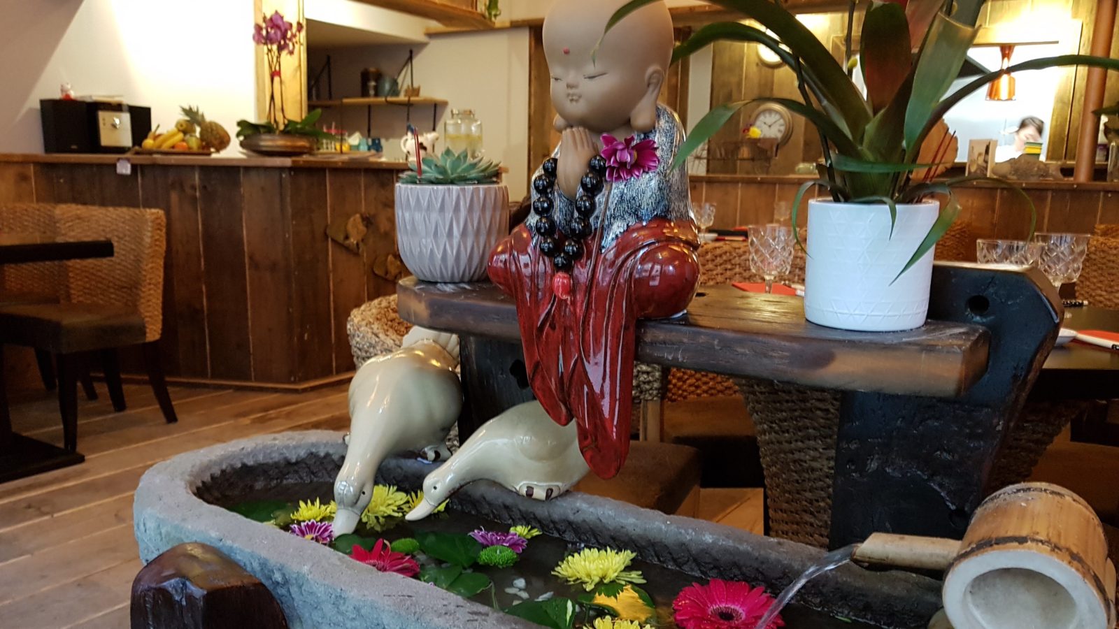 A vibrant water feature greets diners at the door, its relaxed trickle audible throughout the restaurant, where a sweet scent hangs in the air, plants and paintings adorn the walls, lanterns cast a warm glow and melodious music plays overhead.