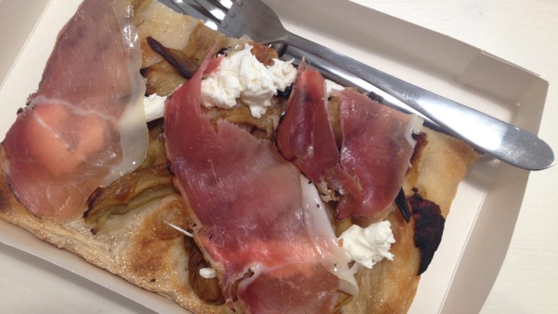 I chose a slice covered in aubergines, torn mozzarella and prosciutto ham (£3 to eat in, £2.50 to take away) and took a seat to eat it, while more long-lost friends entered the shop and were kissed on both cheeks by the owner.