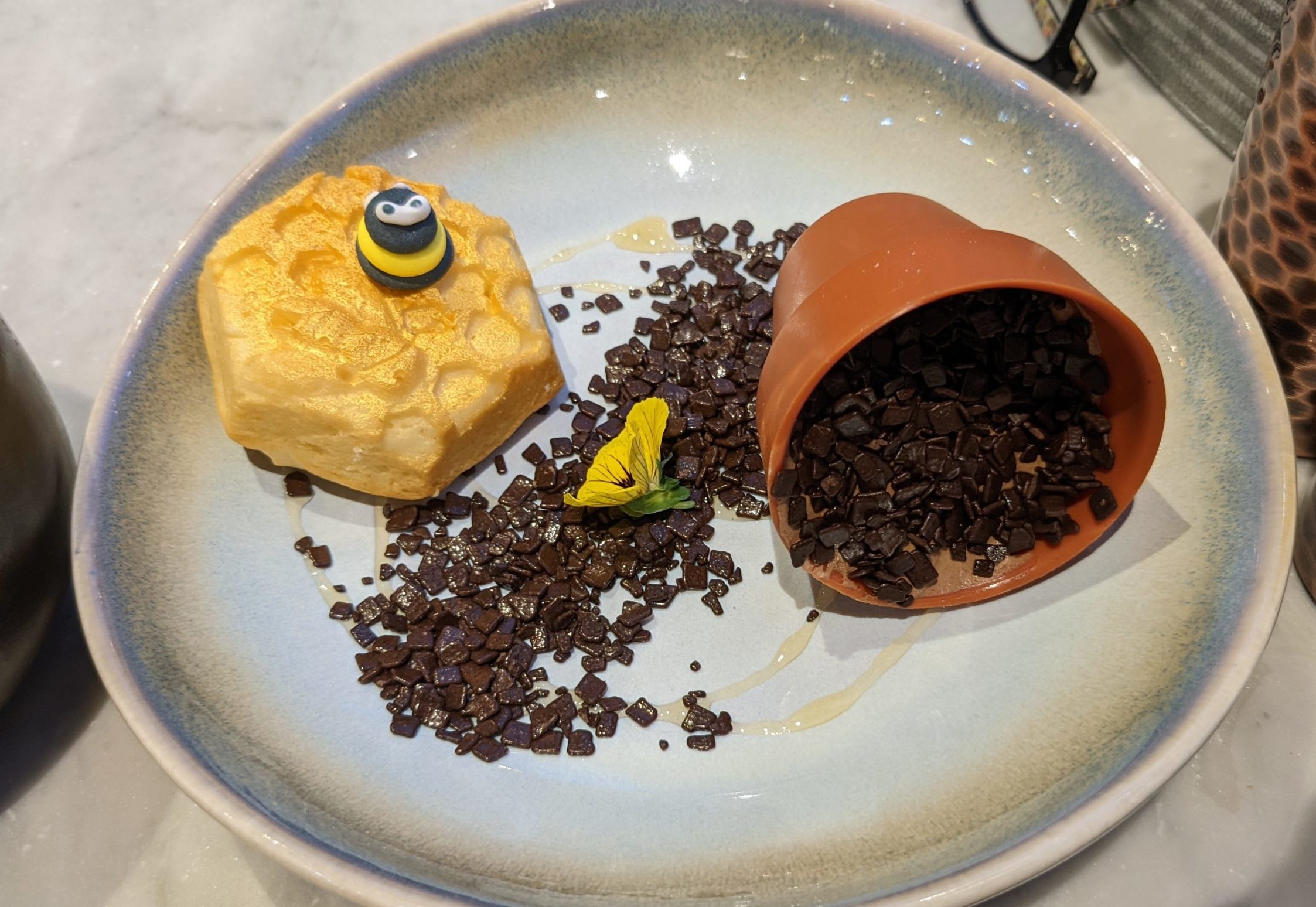 Dessert, a chocolate mousse, honeycomb & salted caramel ‘pot’, golden honey sponge cake (£7.95) is a thing of beauty. In an intricately-presented garden scene, the decadent, rich chocolate mousse is hidden inside a chocolate garden pot. The accompanying sponge honeycomb though has the texture of a bath sponge – and without much more flavour. The Marshfield icecream and sorbet trio (£5.95) works as a nice addition to help cut through the sweetness.