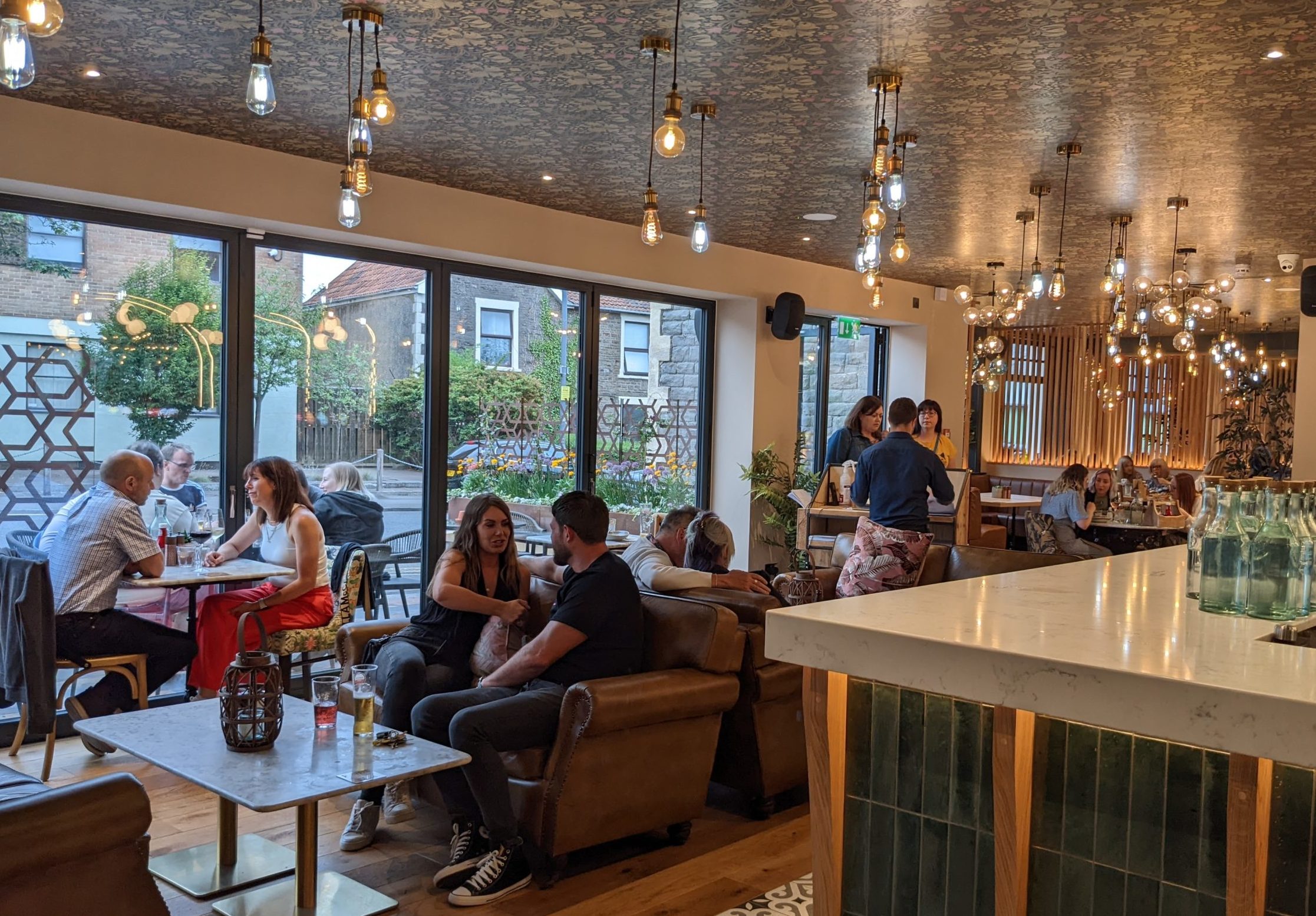 Here, behind a screen and vibrant array of flowers, diners and drinkers spill out onto outside tables and chairs to soak up the summer evening sun.