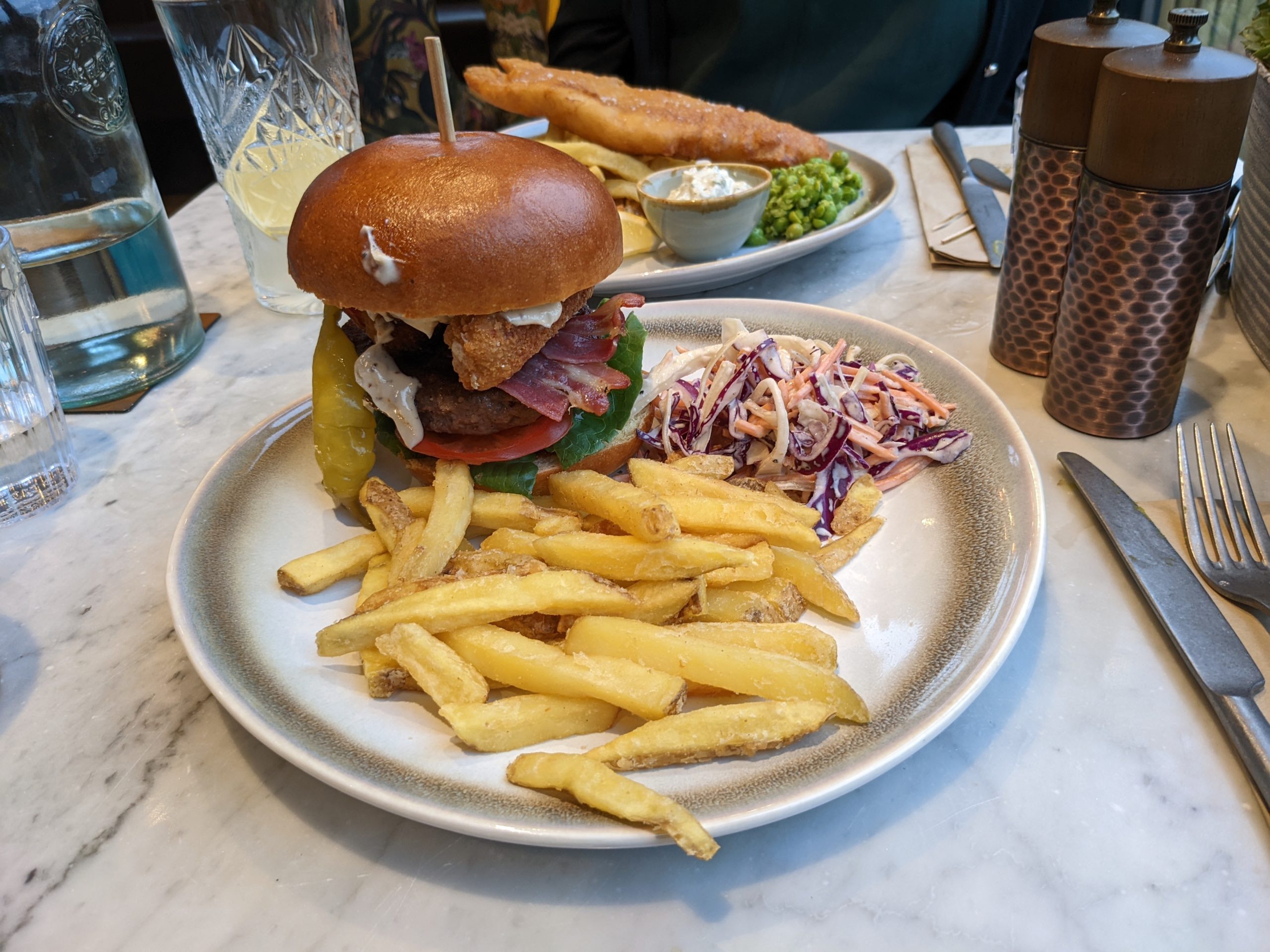 The fish & chips (£15.95) had the potential to be nice. The chips were once delicately fried before being left unloved on a plate, presumably to wait for their weightier companion, to go cold and soggy. The crushed peas, although nicely minted, suffered the same fate. This leaves the modest portion of fish, piping hot with crisp batter, to take the crown.