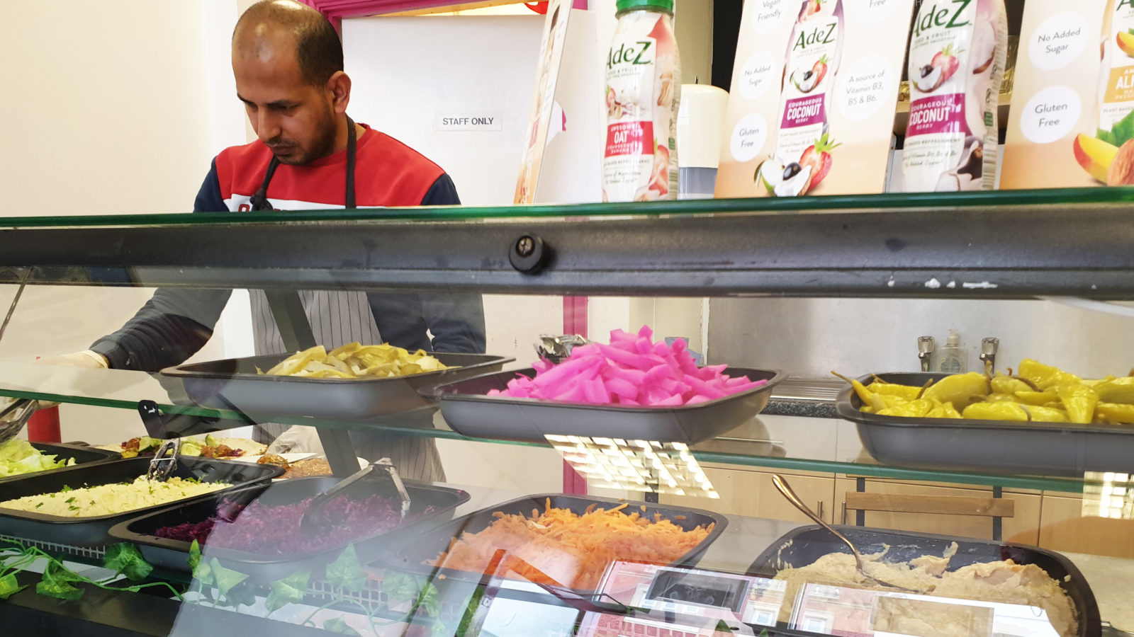 Another few minutes go by, and a large wrap and plate of steaming falafels are brought out from the kitchen, but it transpires that this is the order of the previous customer, the tradesman. As the clock ticks by, some more falafel and another wrap appear from the kitchen. The server smooths homemade hummus over the bread and adds six falafel and asks which salad should be added.