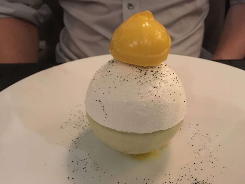 Menus are returned to the table as we debate a digestive or a desert. While tempted by the Psychopomp coffee liqueur (£7 for 25ml), the sweet tooth wins out. From a choice of four we decide on the green tea meringue sphere with saffron and quince sorbet (£11) and the waiting staff kindly bring two sets of cutlery without being asked, before topping up our glasses and bringing yet another amuse bouche of ice-cold sorbet with a tangy citrus jelly and a peppery heat as it dissolves on the tongue.
