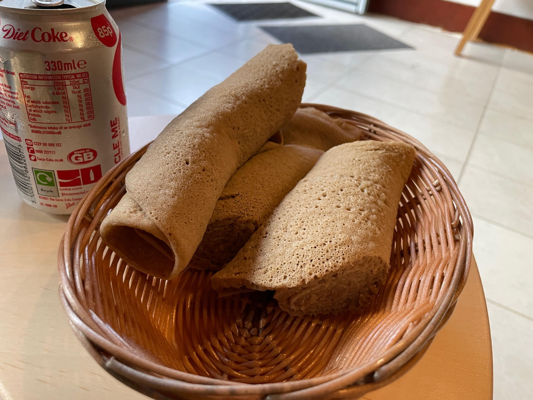Those that do seek it out will be rewarded with injera, a fermented, pancake-like flatbread reminiscent of a rolled-out crumpet, topped with a different daal or vegetable concoction at each hour of its doughy clock face.