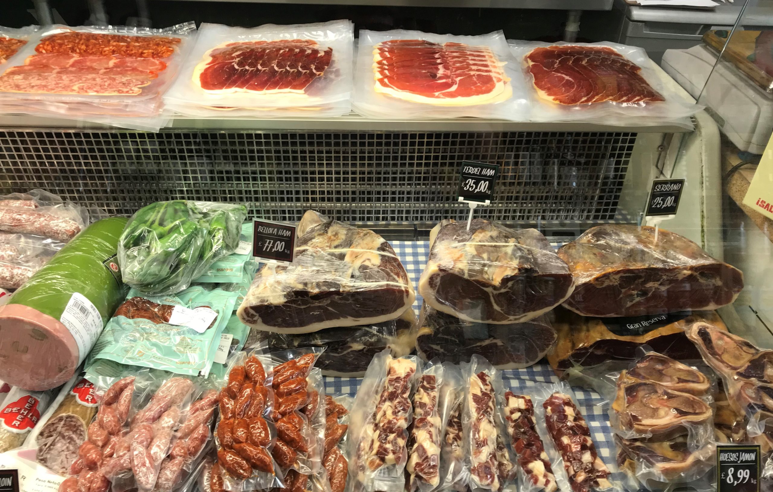 Some of the meat for sale in El Colmado, including bellota, Teruel and serrano ham – photo: Martin Booth