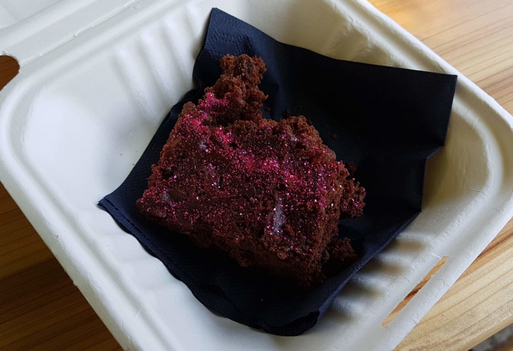 The brownie, glittering with a sparkly pink dust, is slightly crumbly, but with a rich chocolate taste offset by big chunks of ginger that leave a pleasant tang on the tongue – it is just the right level of sweet and moreish, and certainly doesn’t last long.