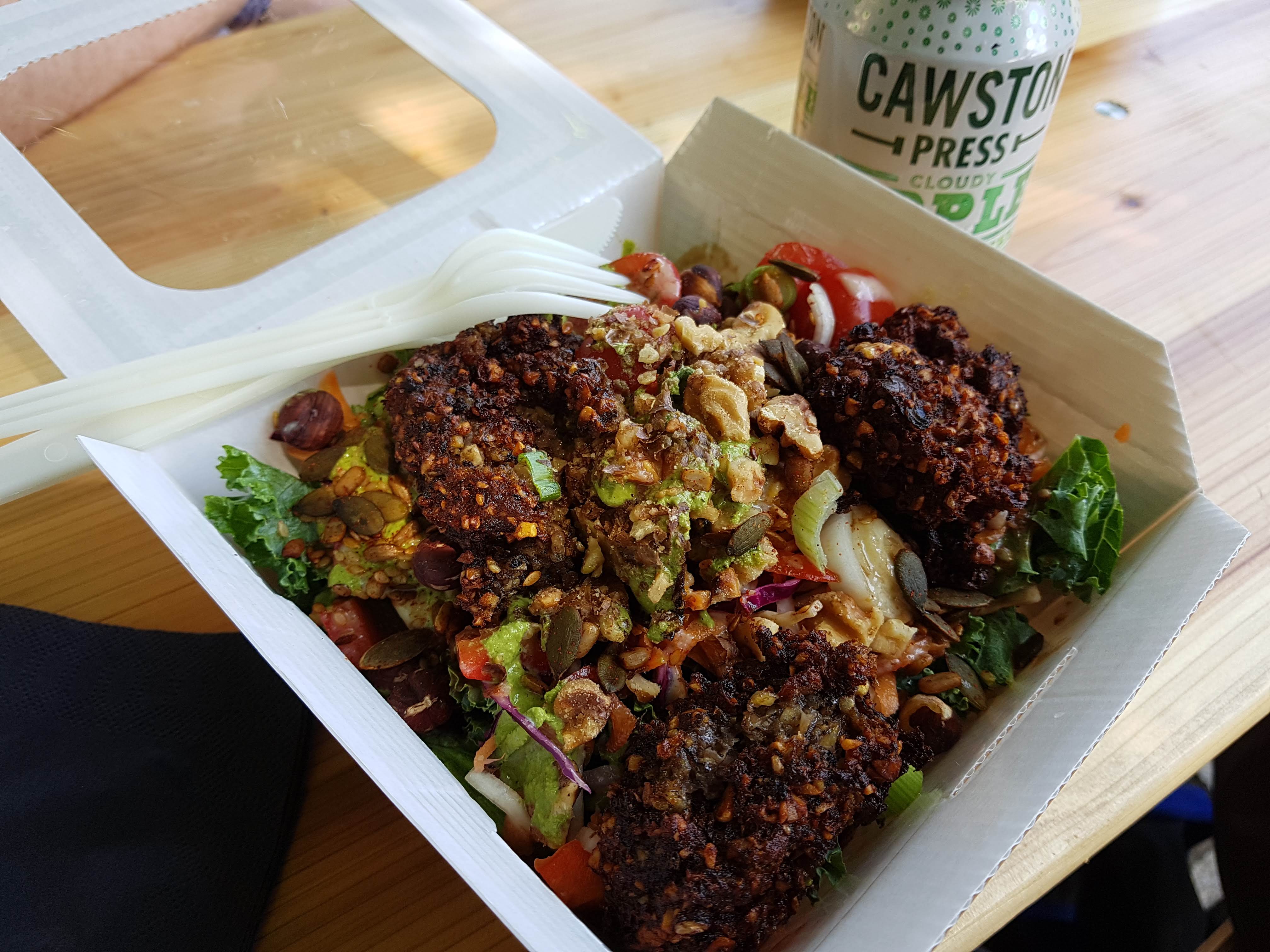 Opting for the salad box, with added mushroom goodness, I give in to temptation and add a vegan brownie, a stack of which are temptingly balanced on the small counter top, and a cold can of apple Cawston Press, before taking my haul over to one of the long tables set out by the waterside.