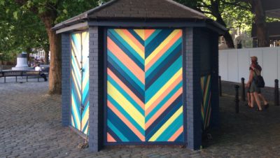 Cheerful green plants now adorn the compact interior and exterior of the striped kiosk, which back in the day peddled hot donuts.