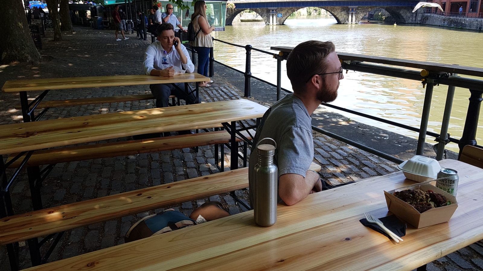 Opting for the salad box, with added mushroom goodness, I give in to temptation and add a vegan brownie, a stack of which are temptingly balanced on the small counter top, and a cold can of apple Cawston Press, before taking my haul over to one of the long tables set out by the waterside.