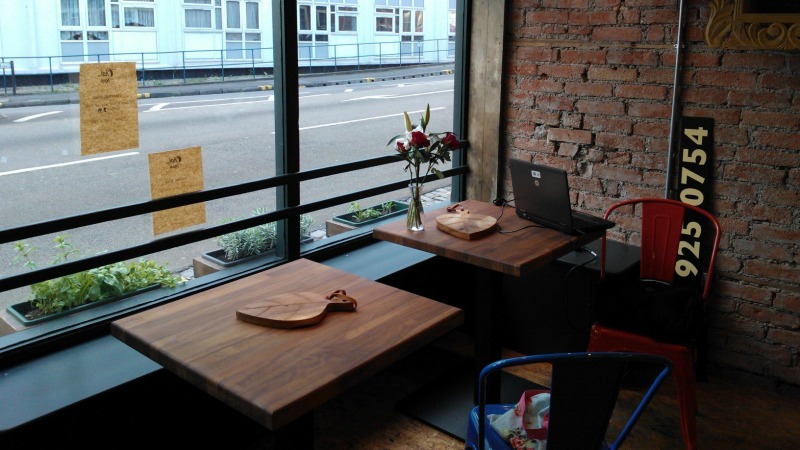 If you do choose to eat in, there are a couple of tables in the window of a small room with exposed brickwork, oversized lamps and metal chairs in primary colours.