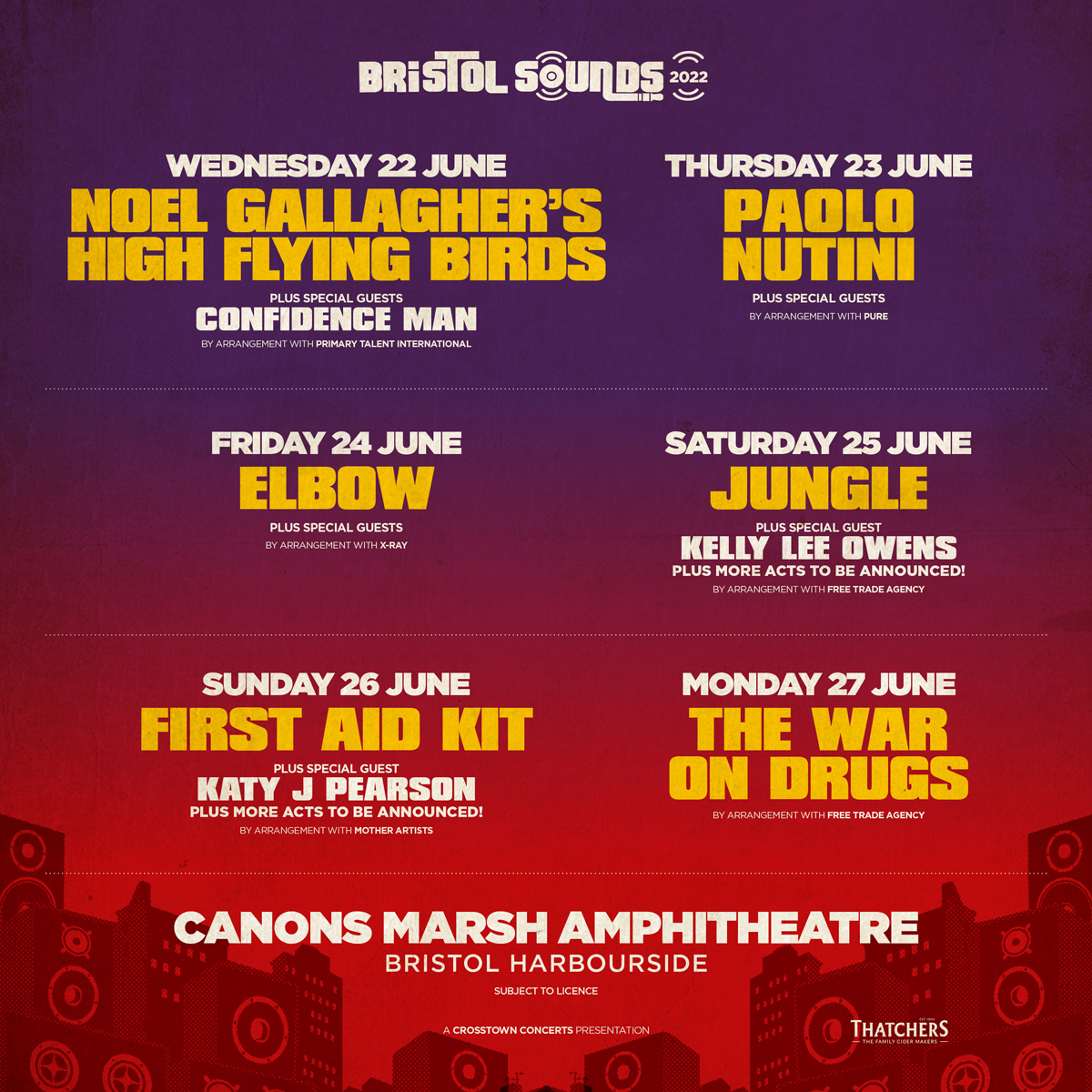 Bristol’s much-loved open-air series of concerts returns to Lloyds Amphitheatre on Bristol’s harbourside from June 22-27 this year with an eclectic line-up of must-see artists including Noel Gallagher’s High-Flying Birds, Paolo Nutini, Elbow, Jungle, First Aid Kit and The War on Drugs.