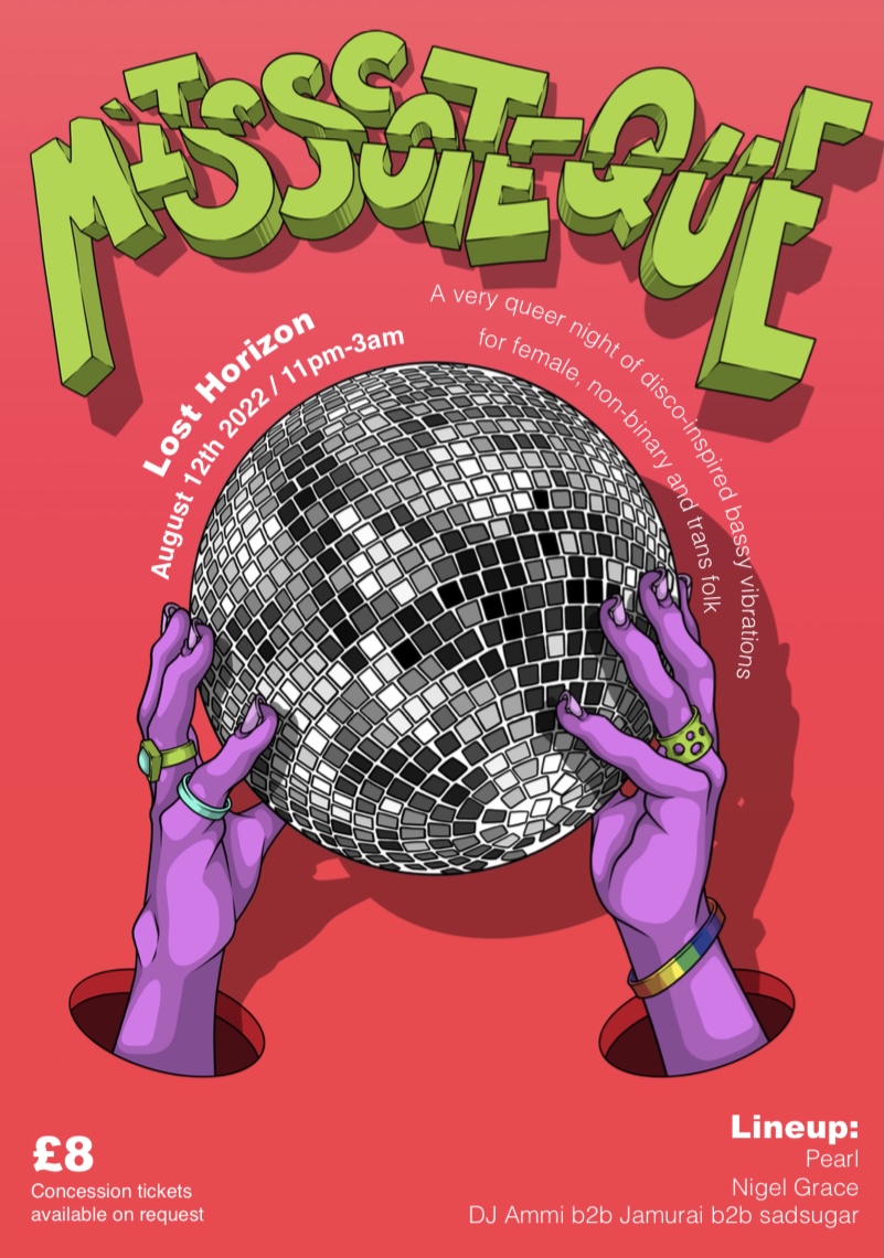 Misscoteque is returning to Bristol, fresh off the back of their Shangri-la, Glastonbury festival takeover and just a year on from their first DIY event. Exclusively for women, trans and non-binary folk, Misscoteque showcasing Bristol’s finest FLINT* artists and DJs. They are also keen to open their arms towards the older members of the lesbian and queer fem/non-binary community.