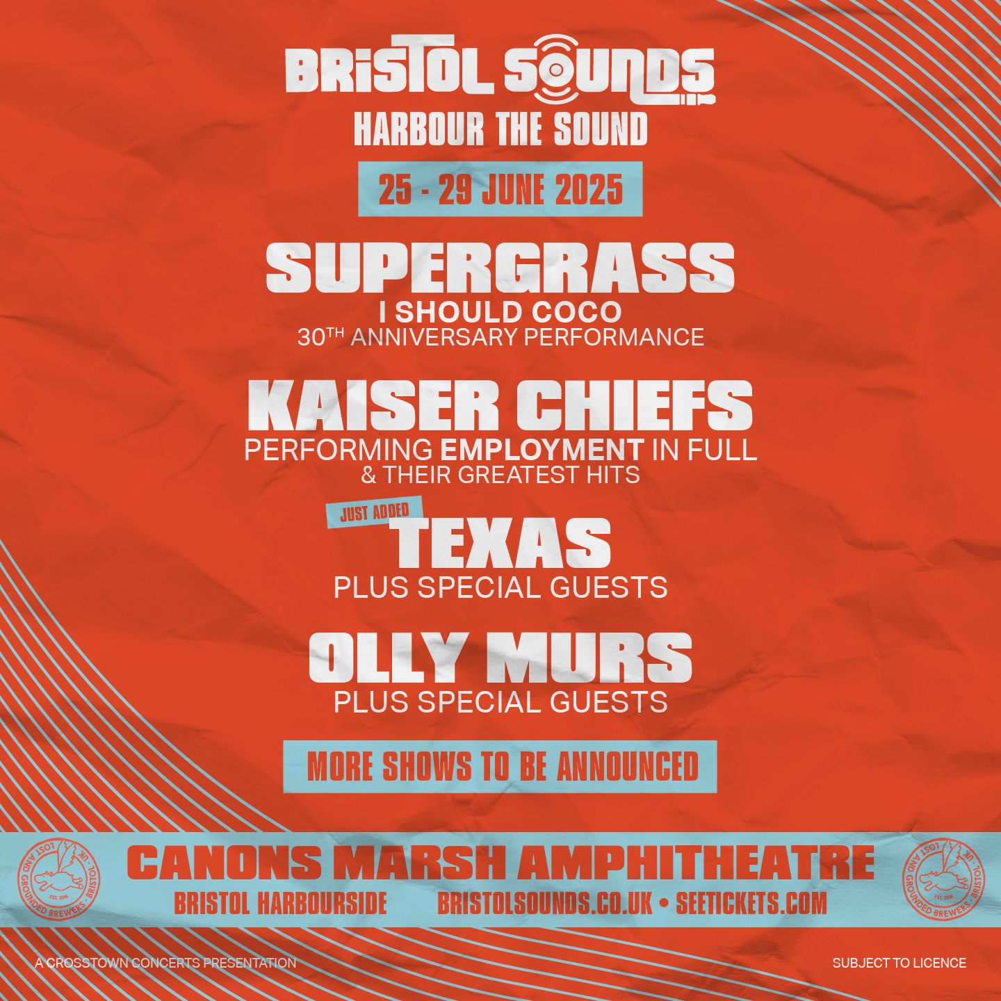 Bristol! Tickets for this year’s Bristol Sounds are on sale now! Don’t miss your chance to see incredible performances from Supergrass, Kaiser Chiefs, Texas, and Olly Murs. Our Saturday headliner will be revealed very soon – stay tuned for announcements!