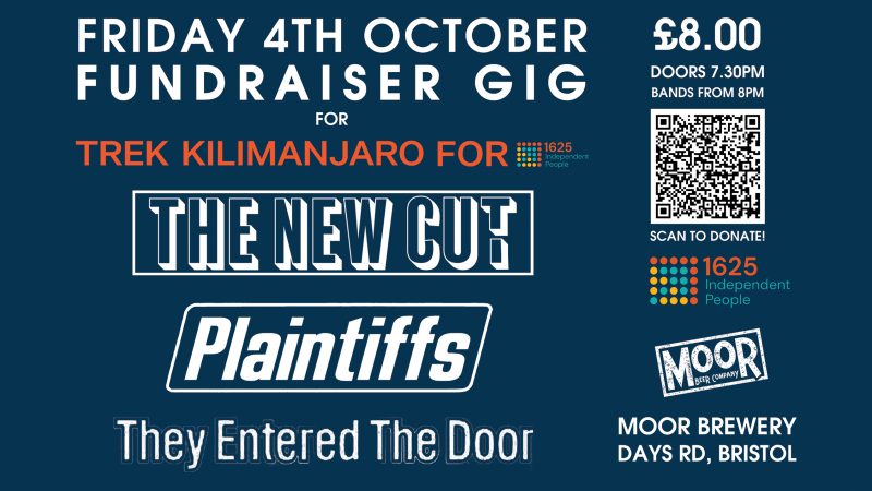 Bands! Beer! Bristol talents The New Cut, Plaintiffs and They Entered the Door are getting together to raise money for 1625 Independent People, a local charity supporting young people at risk of homelessness and care leavers across Bristol and the South West. Come early, stay late!