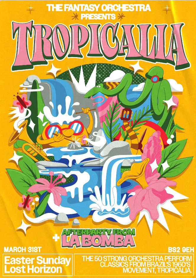 A vibrant Sunday evening, soundtracked by the colourful rhythms of Tropicália, a sound created in Brazil in the late 60s/early 70s. Fusing traditional Brazilian music with modern rock and pop sounds, the 50 piece orchestra will keep you dancing to see out the weekend.