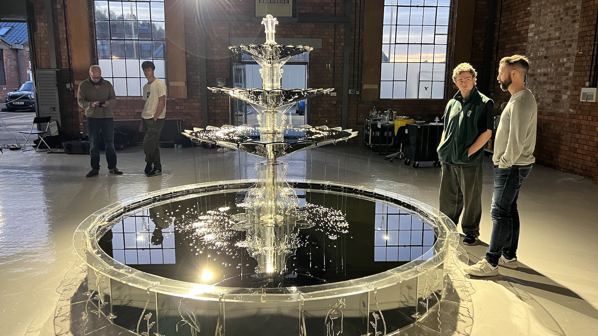 Oil Fountain is a fountain sculpture which flows with artificial oil instead of water, falling into black mirror-like pools – photo: Luke Jerram