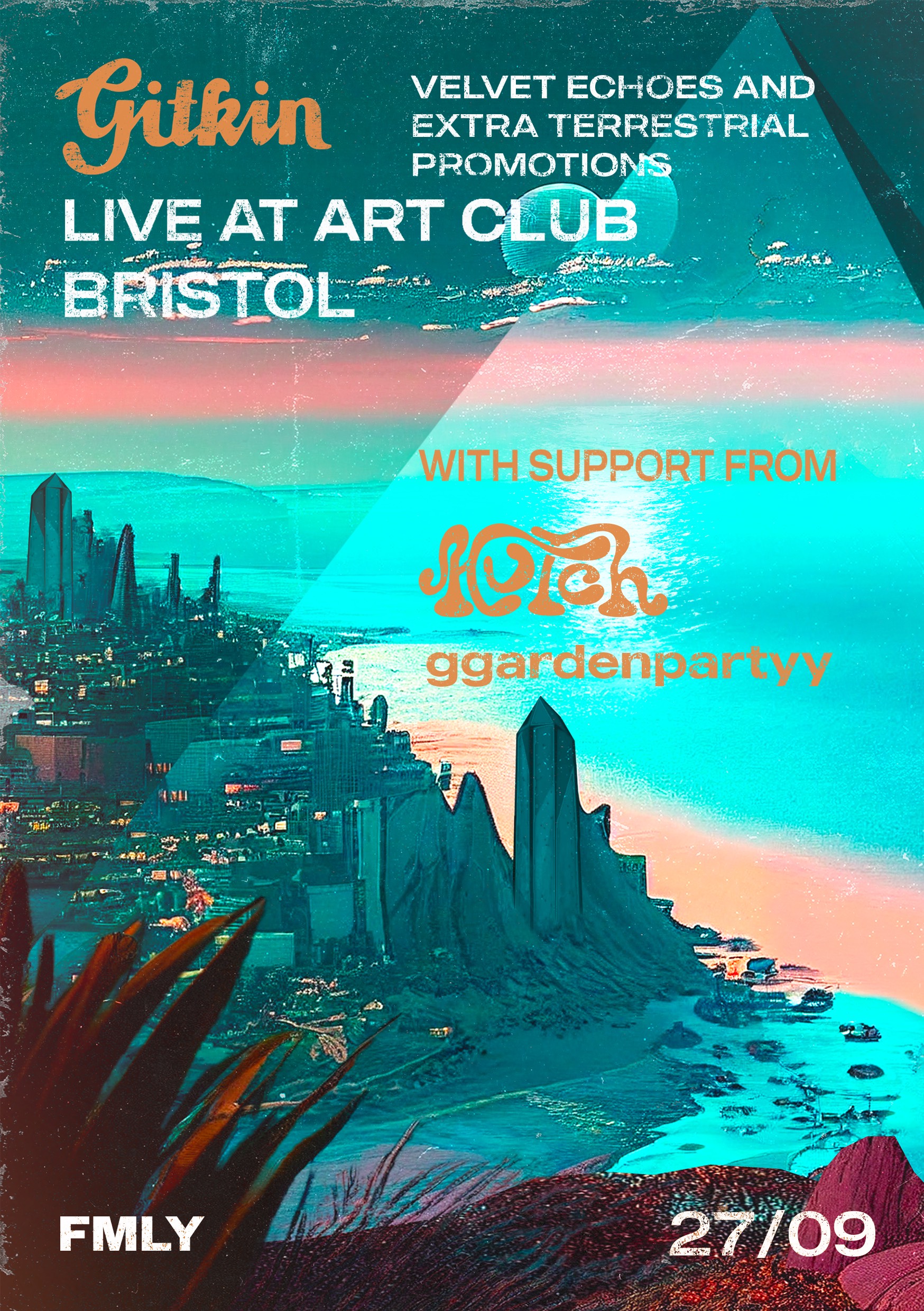Velvet echoes and extra terrestrial promotions present rhythmic world music artist Gitkin with support from Brighton based surf rockers Hutch.