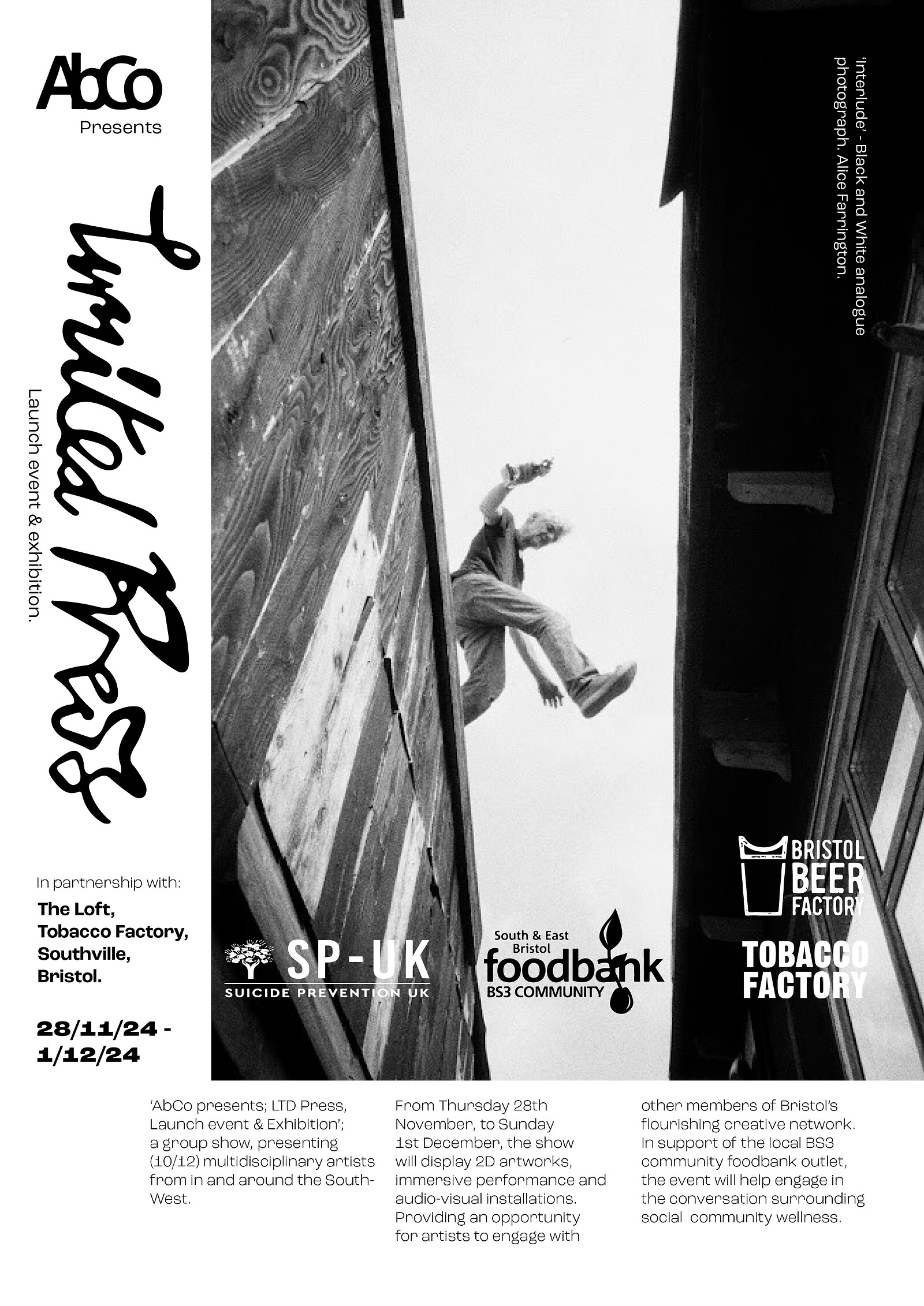 AbCo and Limited Press are hosting 12 artist at Tobacco Factory’s loft space for an exhibition that will also mark the launch of their new art led agency. Monetary and food donations collected at the exhibition will go towards St Paul’s, BS3 Foodbank and Suicide Prevention.