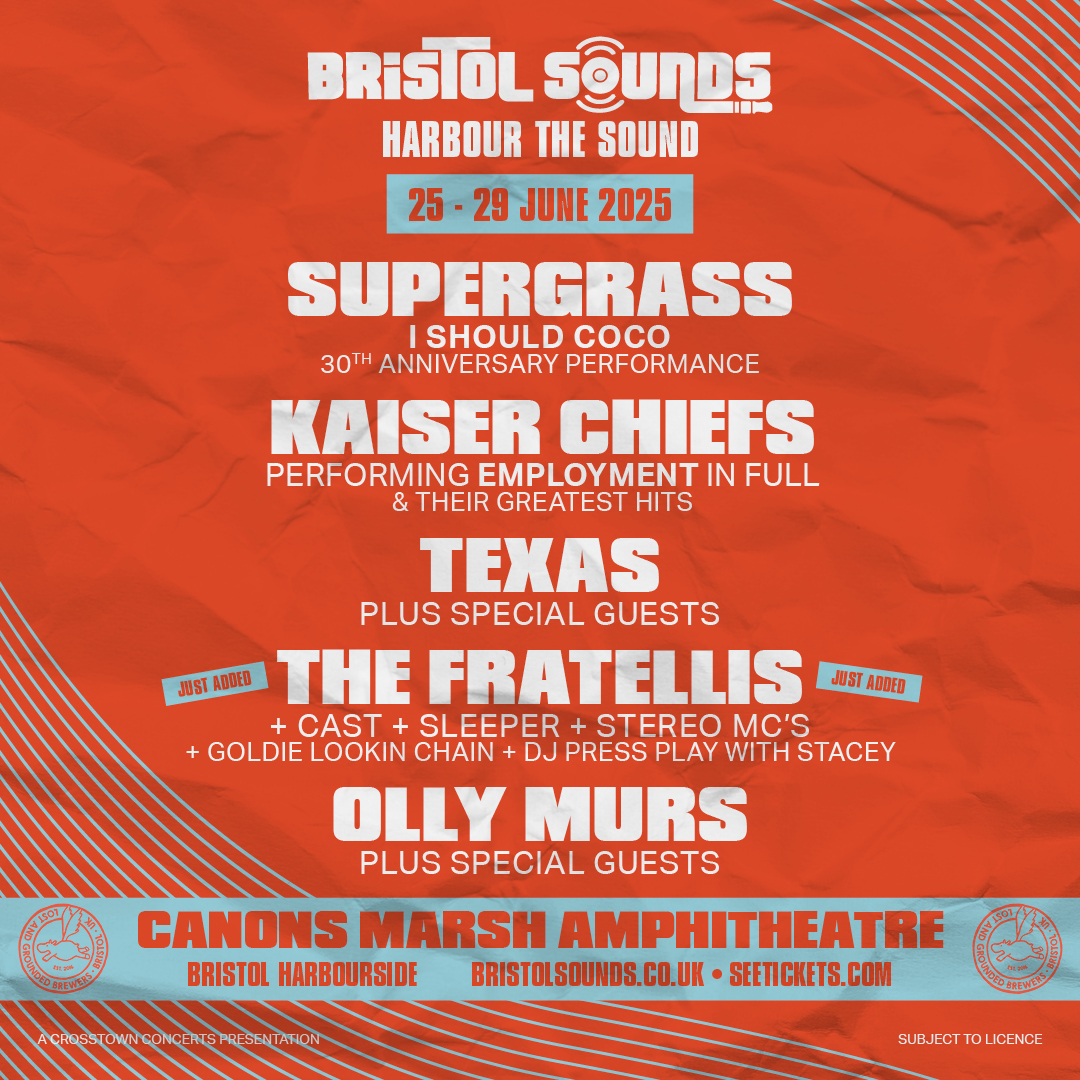 Tickets for this year’s Bristol Sounds are on sale now! Don’t miss your chance to see some incredible performances on Bristol’s Harbourside from Supergrass, Kaiser Chiefs, Texas, The Fratellis and Olly Murs.