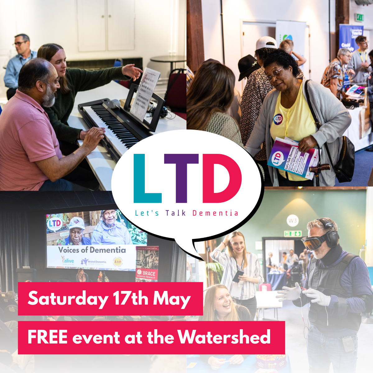 Let’s Talk Dementia is a free information event on all things dementia. The event is taking place at the Watershed on Saturday 17th May 10.30am – 4.30pm. Meet dementia experts, join in a dementia friendly activity or go to a short talk. Join at anytime and stay for as long as you would like.