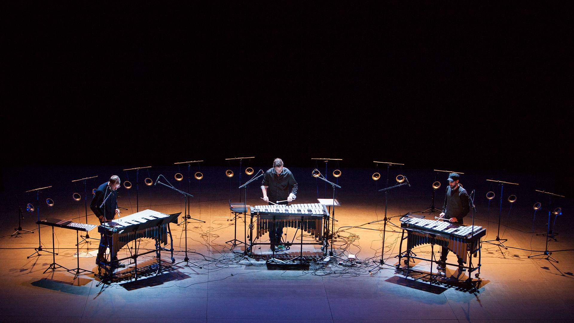 Tristan Perich’s Open Symmetry pares Ensemble 0 down to just 3 musicians playing the resonant metal bars of 3 vibraphones with a glistening ensemble of 20 speakers, each playing their own musical part of the composition. 1-bit sound is Perich’s core musical language, each composition an experiment in sonic colour, shape, and form.