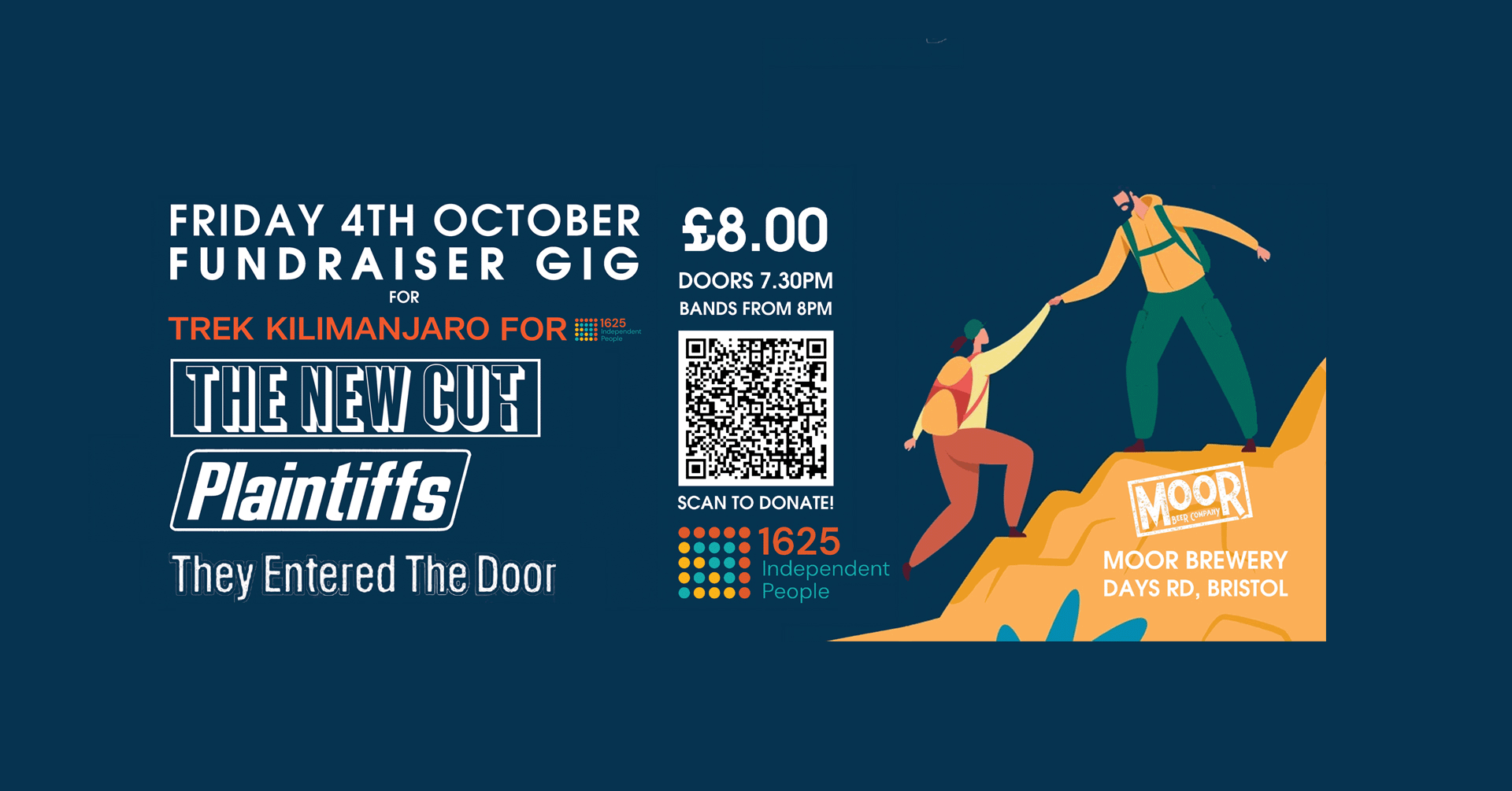 Bands! Beer! Bristol talents The New Cut, Plaintiffs and They Entered the Door are getting together to raise money for 1625 Independent People, a local charity supporting young people at risk of homelessness and care leavers across Bristol and the South West. Come early, stay late!