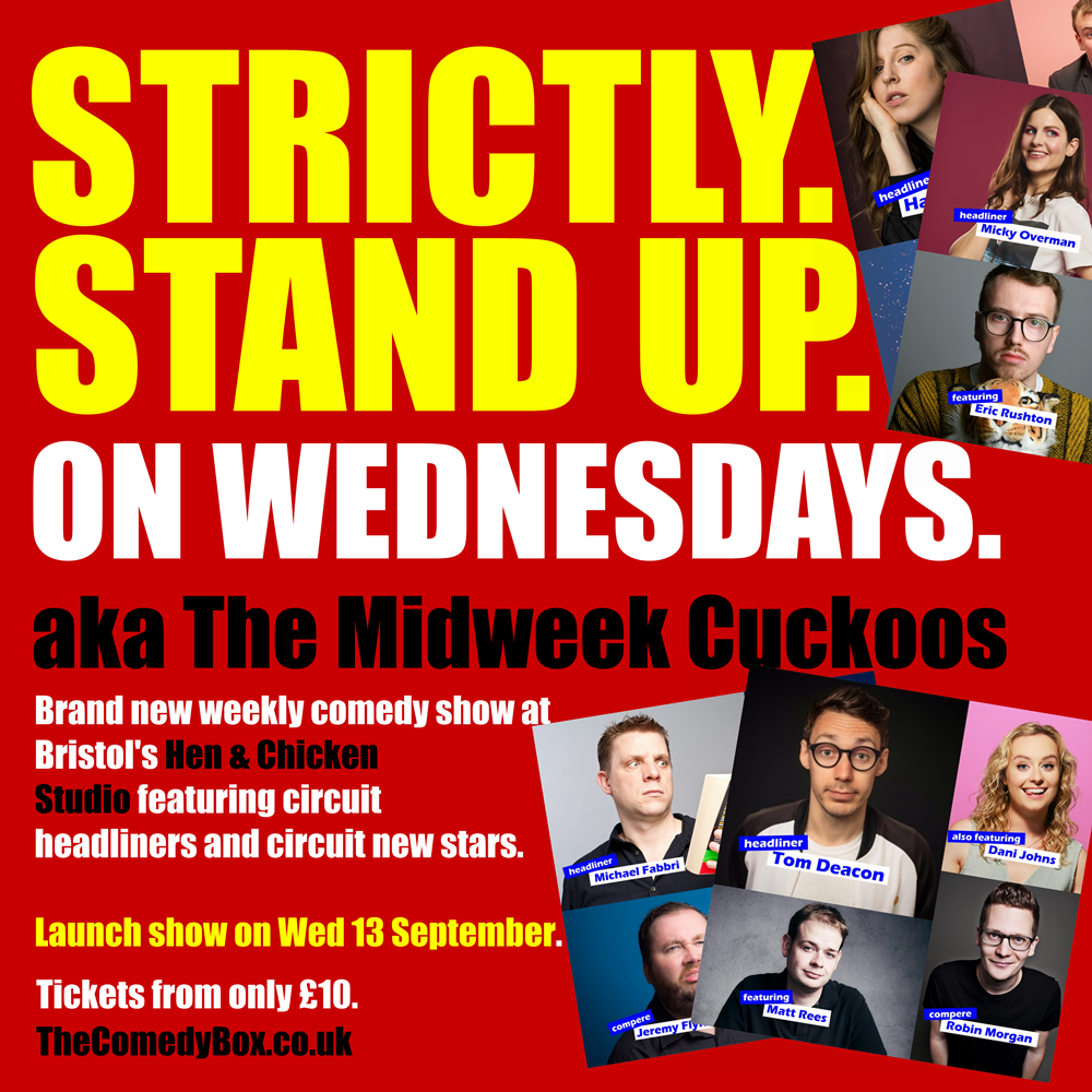 The Comedy Box is launching a brand new weekly midweek show on Wednesdays called STRICTLY STAND UP ON WEDNESDAYS. Also in the Hen & Chicken Studio, this new show will feature a mix of circuit headliners and exciting circuit new stars with tickets starting from only a tenner. Launch night is Wednesday 13 September. Headliners include MICHAEL FABBRI, TOM DEACON, HATTY PRESTON and MICKY OVERMAN. Every Wednesday.