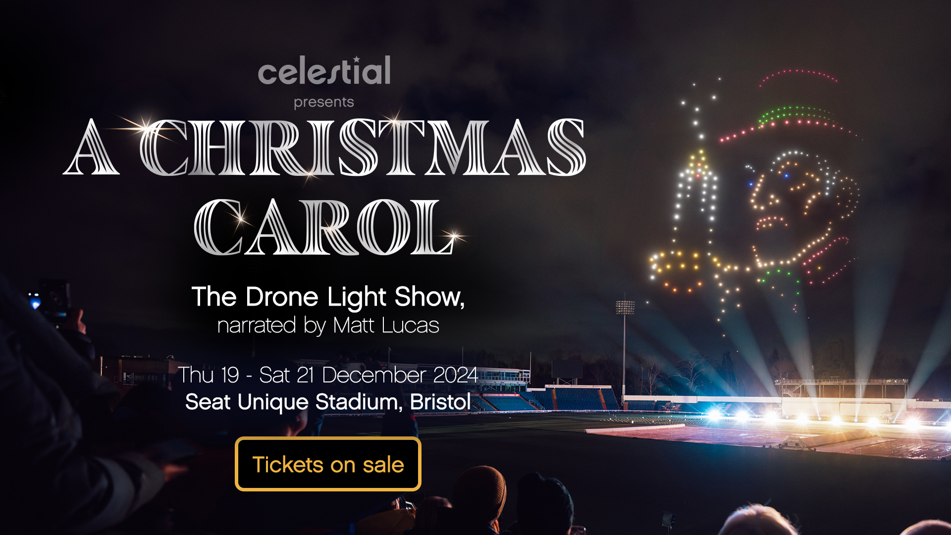 A brand new festive drone show is flying into Bristol this December. Back by popular demand, Yuup and Celestial return to Seat Unique Stadium with A Christmas Carol, The Drone Light Show. Embark on a dazzling adventure through Dickens’ timeless classic on the world’s biggest stage – the sky, all charismatically narrated by Matt Lucas.