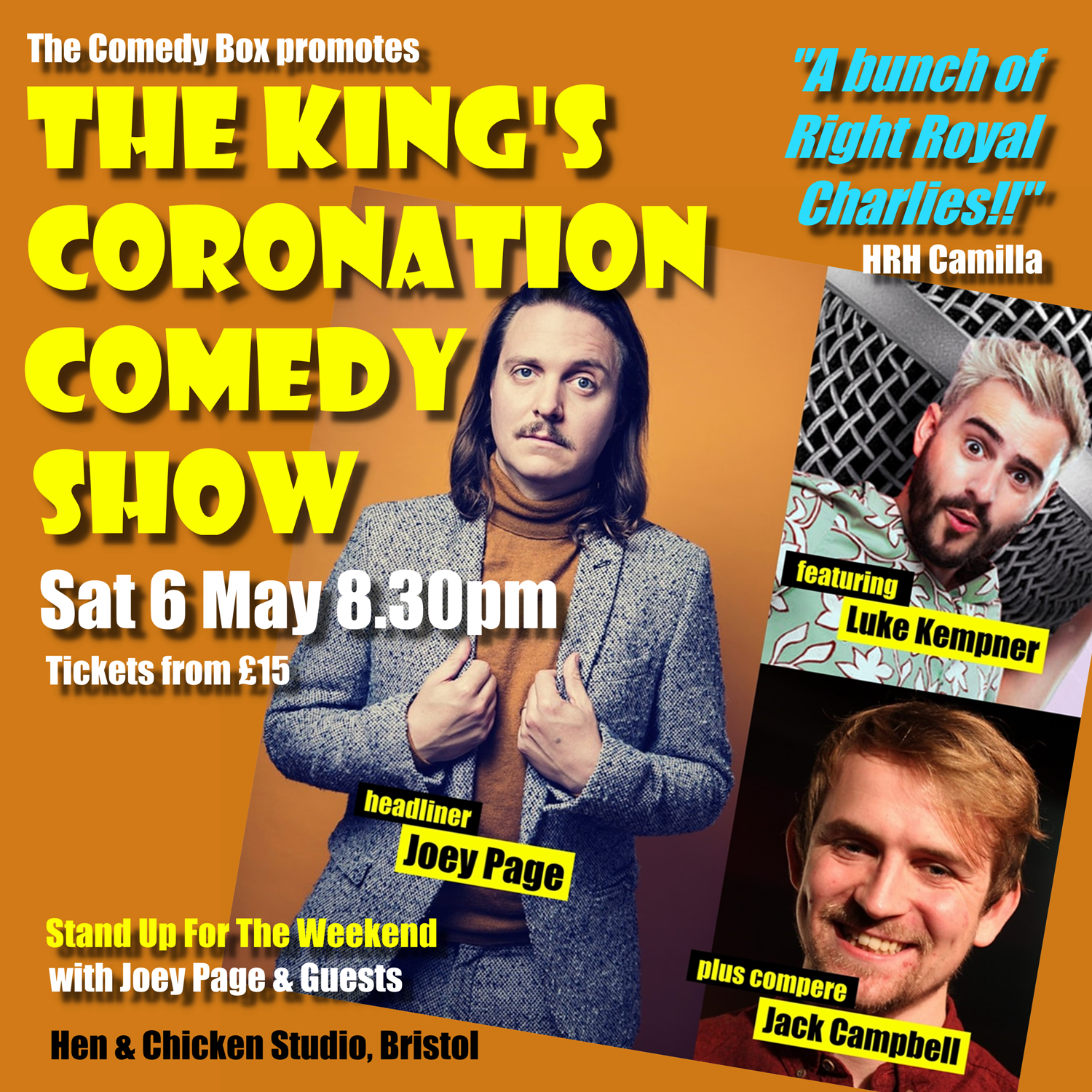 May 6: The Comedy Box promotes: THE KING’S CORONATION COMEDY SHOW with JOEY PAGE and GUESTS, Hen & Chicken
