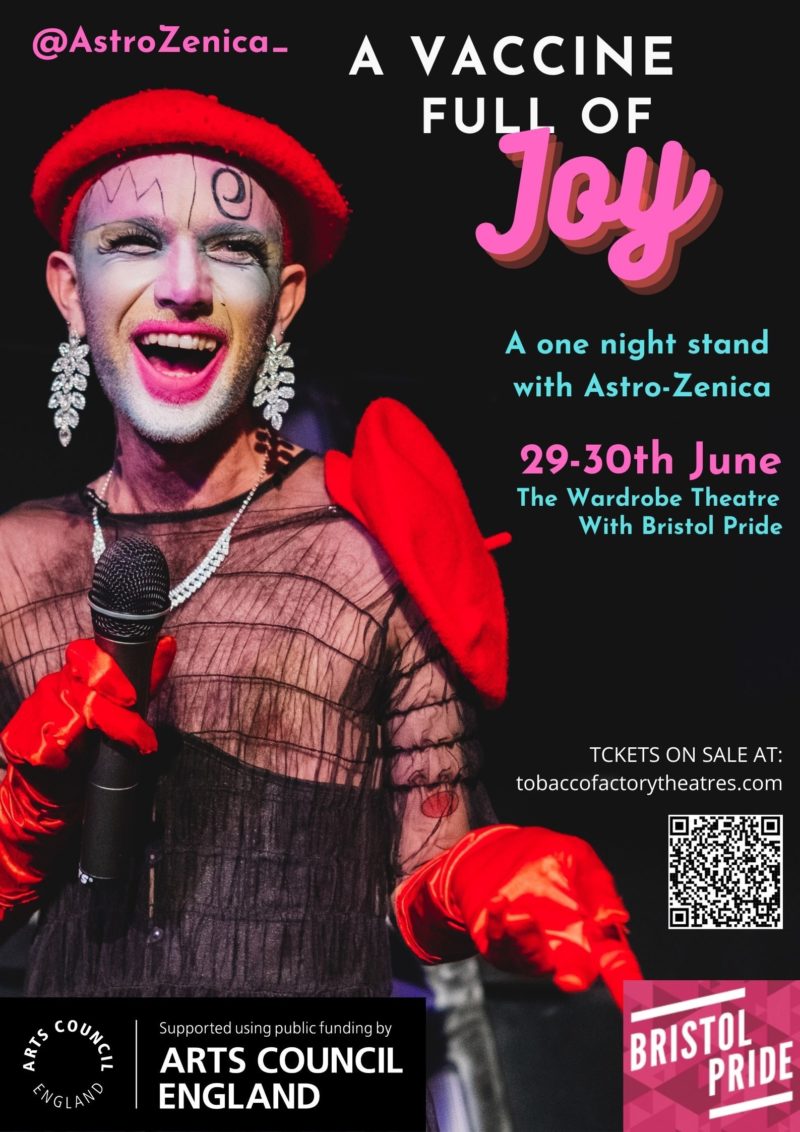 Around Pride Day, Bristol Pride is in fact a multi-week-spanning festival featuring a multitude of cultural events in June and July, from performances, workshops and talks to clubnights and socials. Astro-Zenica will be giving the much-anticipated debut performances of A Vaccine Full of Joy: A one night stand with Astro-Zenica, at The Wardrobe Theatre, on June 29-30.