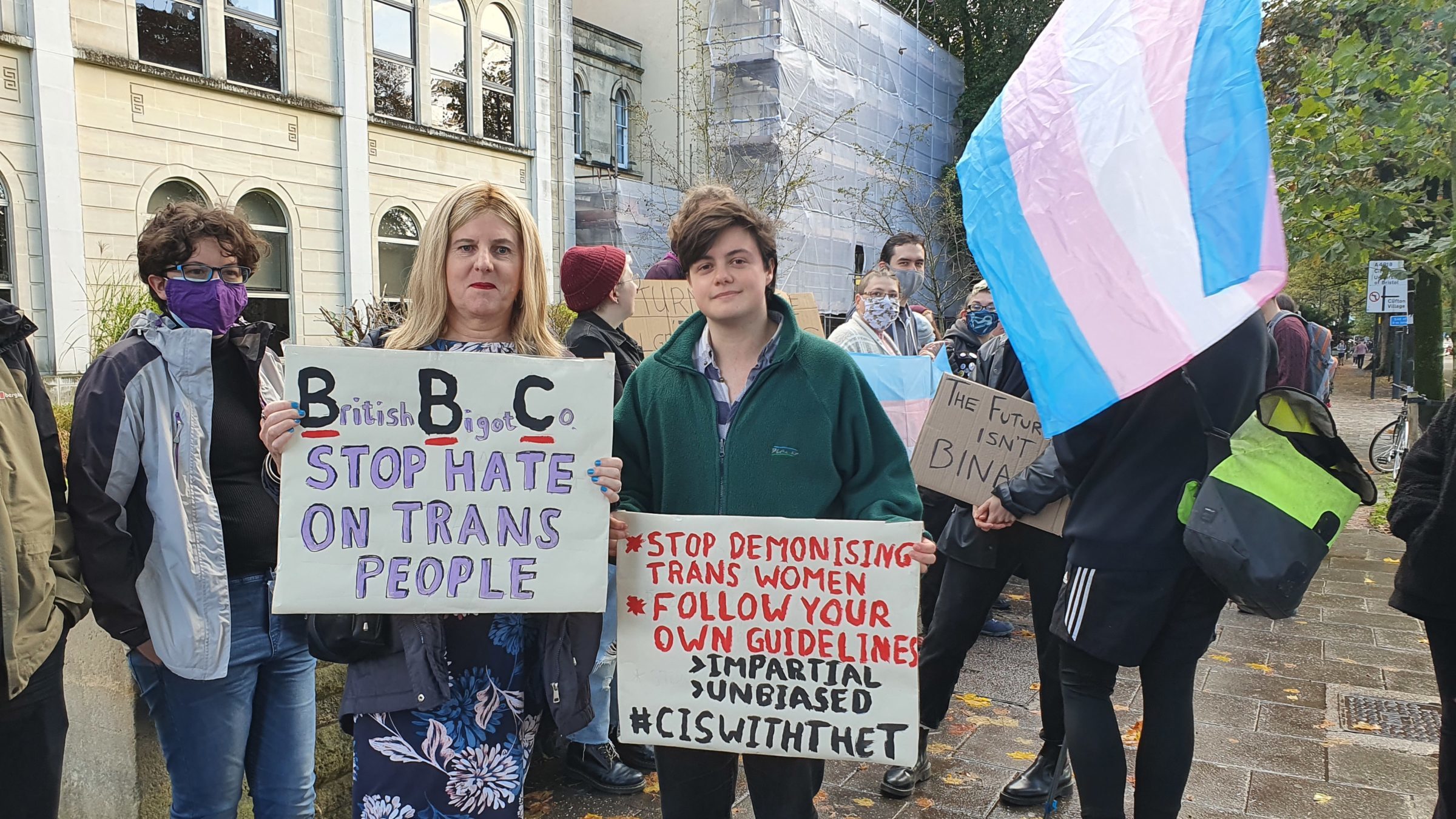 Protesters demand accountability outside BBC offices on Whiteladies Road – photo by Ellie Pipe